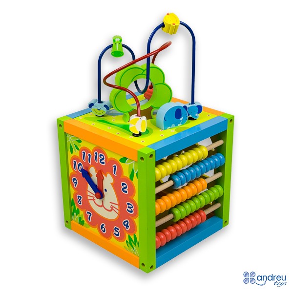 Fantástico cubo de 5 actividades Andreu Toys fabricado en madera: incluye pizarra, formas entrelazadas, laberinto,...