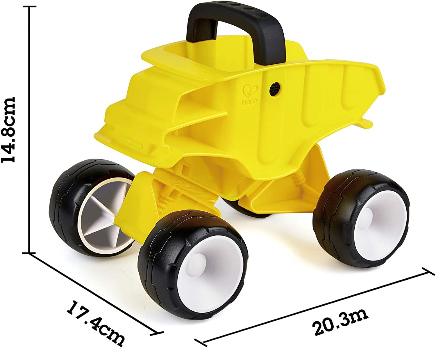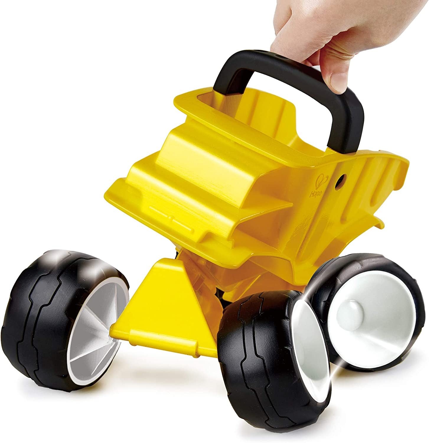 Yellow dump truck with a tilting body and easy-to-grip handle that kids will love to play with. Its low-profile tires and independently rotating wheels make it ideal for both indoor and outdoor play.