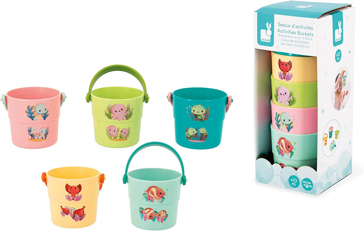 Janod Bath Toy Set consisting of 5 buckets with holes in the bottom. Each bucket features a different design with a baby sea animal and a number from 1 to 5. The buckets can be stacked, floated, and filled with water to watch them empty. Ideal for developing fine motor skills and imagination in young children.