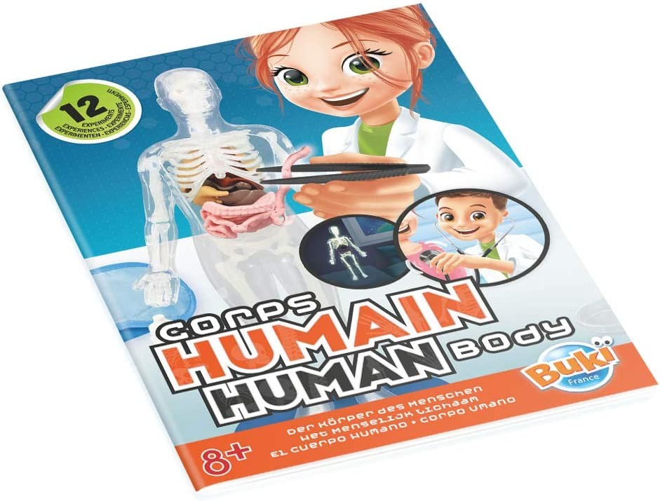 Science kit containing 12 experiments to understand the secrets of the human body: experiments on sight, taste, smell, hearing, touch, culturing bacteria, making viscous mucus and listening to your heartbeat with the stethoscope.