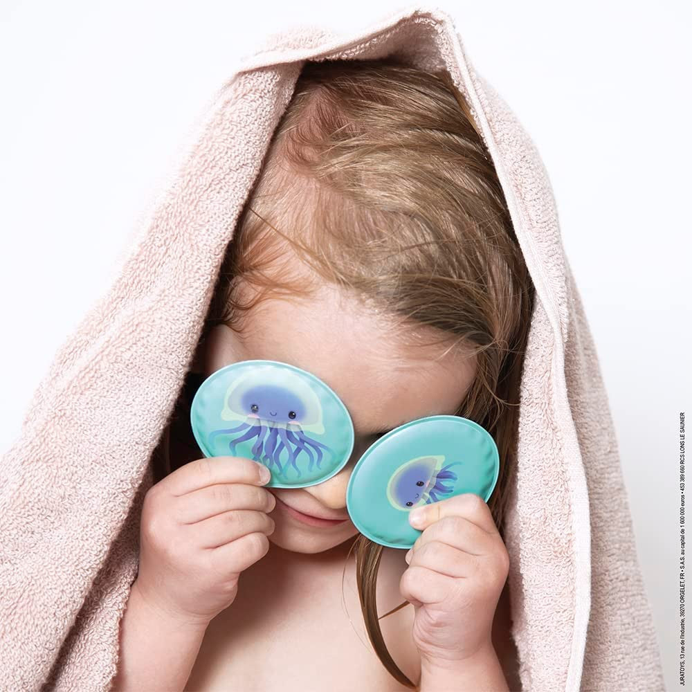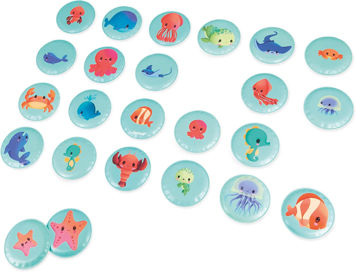 Janod's My Baby Animals Memory Game is a fun bath game where children match each baby animal with its mom or dad. It contains 24 round, floating pieces featuring sea animals and their babies that stick to the tiles when wet.