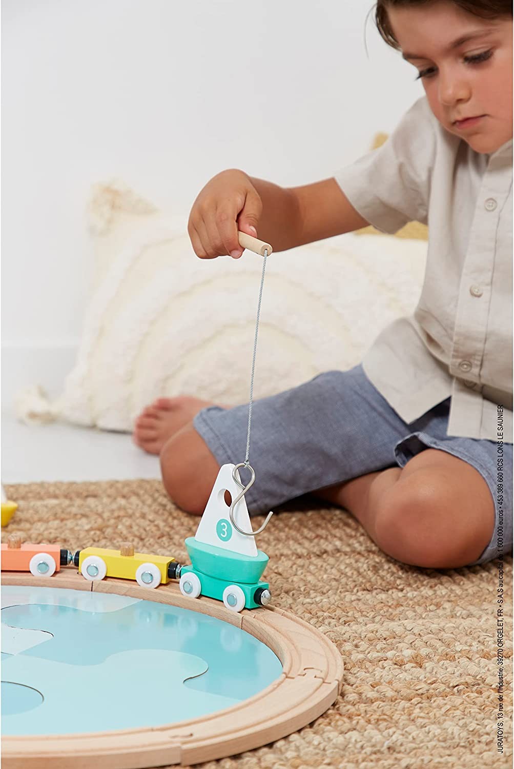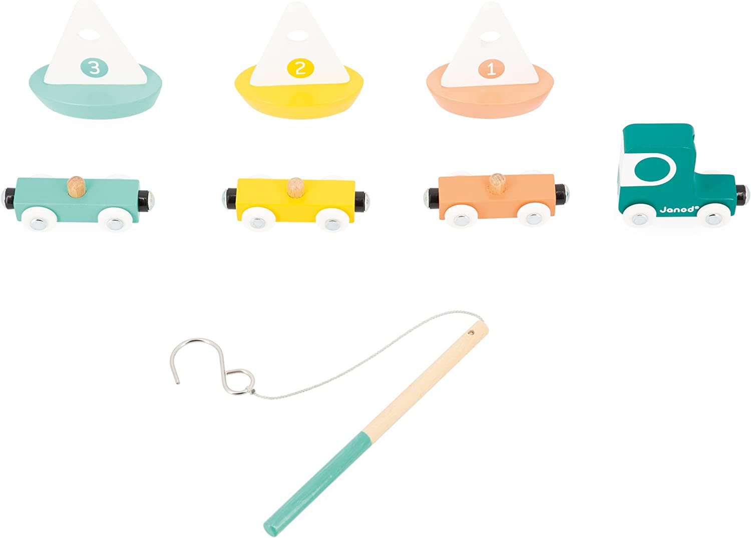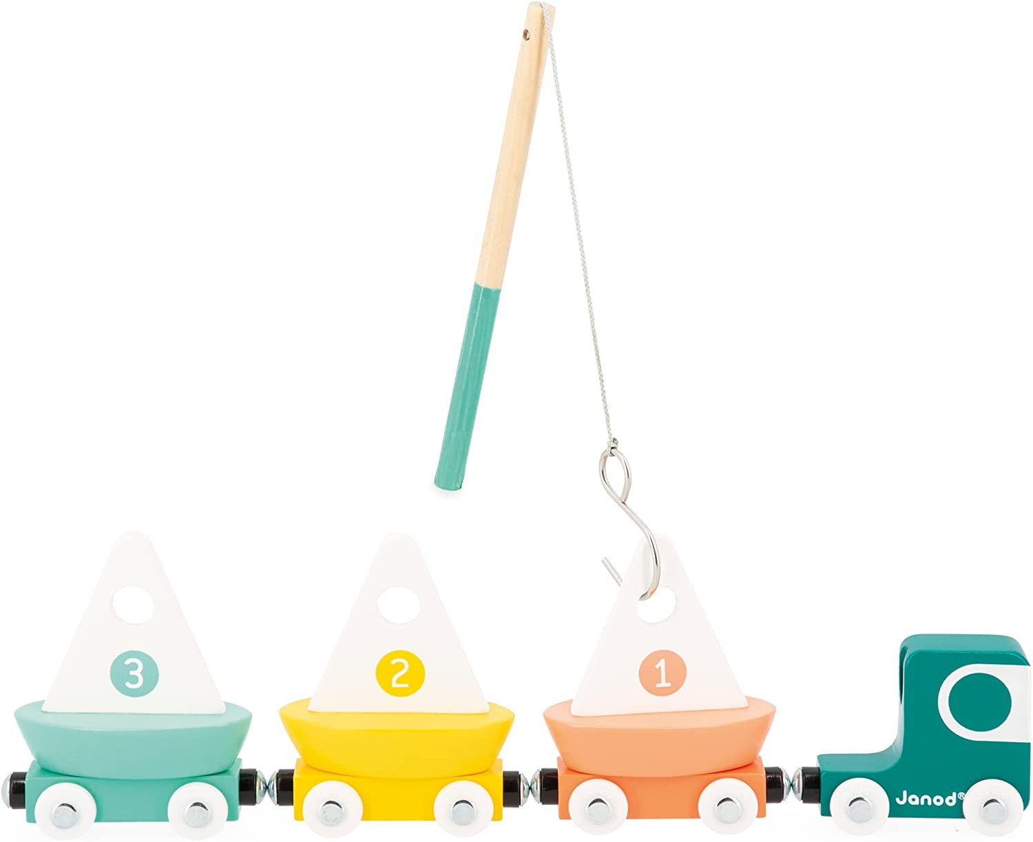Once the sailboats are loaded onto the wagons, the truck is ready to take a spin around the track. It's ideal for developing children's imagination and motor skills. The fishing rod is stored in the back of the cab when not in use.
