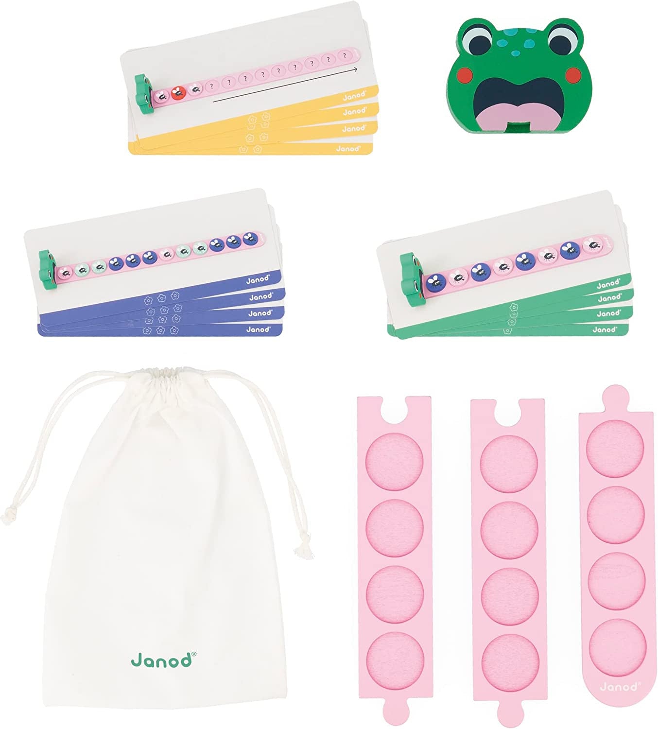Contains 1 frog, 3 pieces of tongue, 36 fly tokens, 12 pattern cards, 1 cotton bag and 1 explanatory leaflet.
