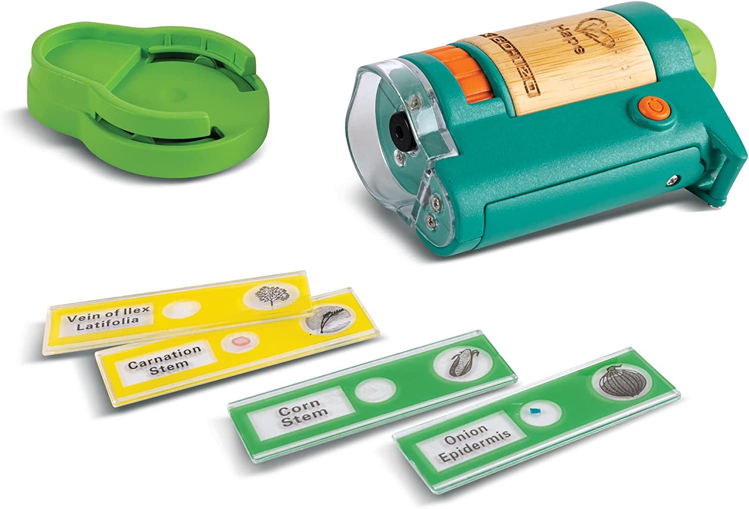 It is very easy to use and quick to assemble. With LED lighting to provide clear, distortion-free image quality, and made from sustainable bamboo and green PE materials, it includes an LED light, power button, and two microscope slides.