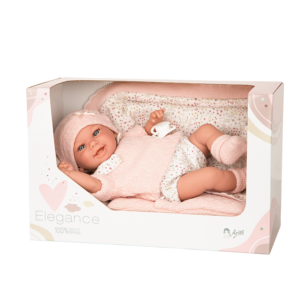 The 35cm Babyto Elegance doll is dressed in a pink and white floral outfit with a matching blanket. Its weight is so realistic it feels like a real baby. A pacifier and blanket are included.