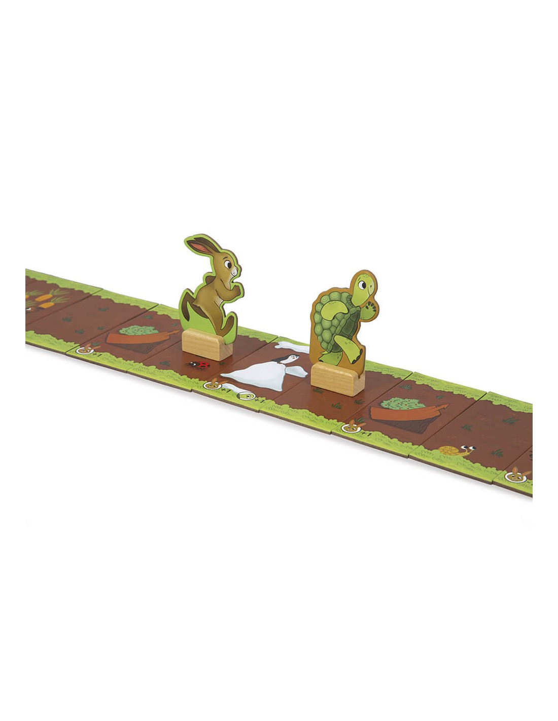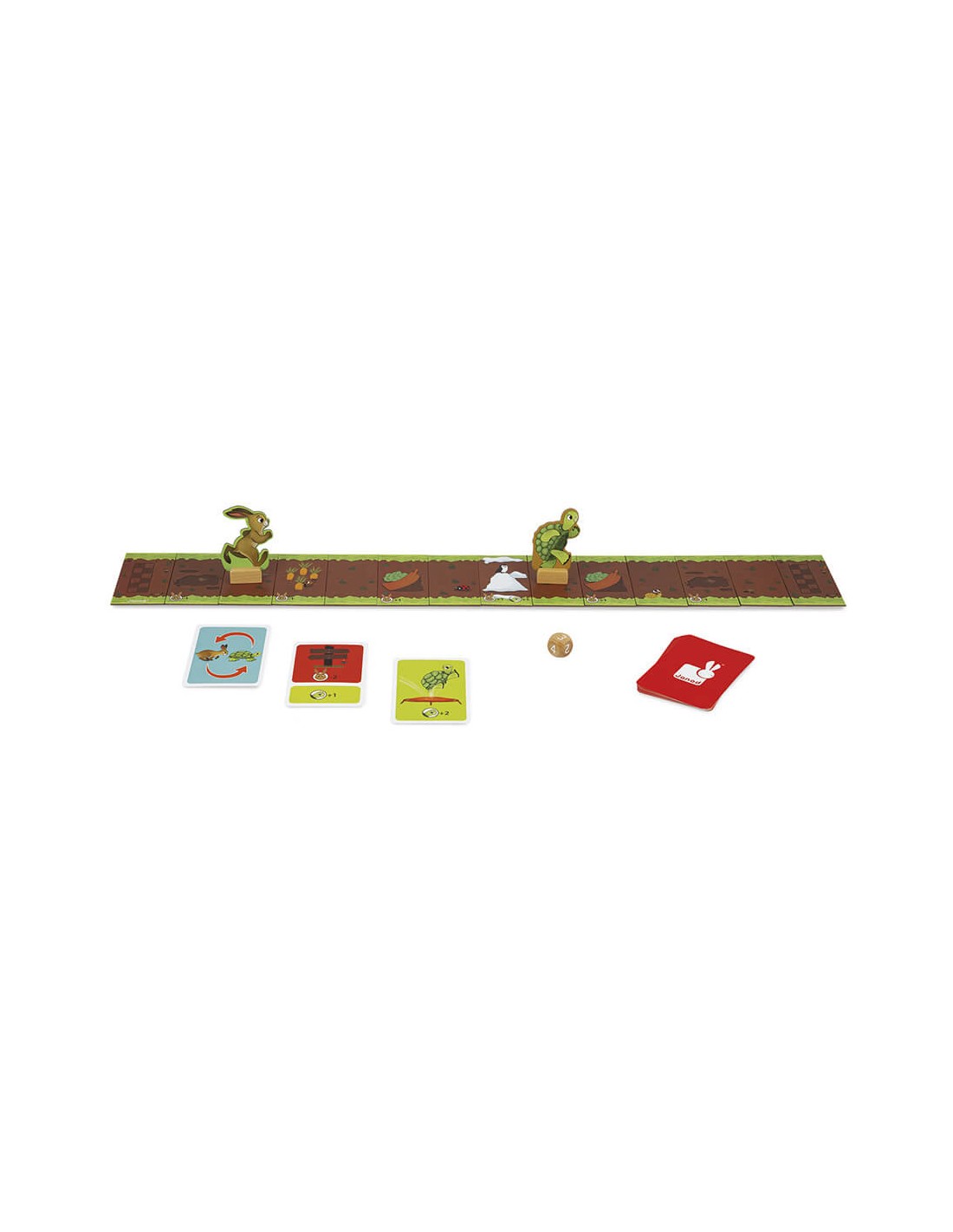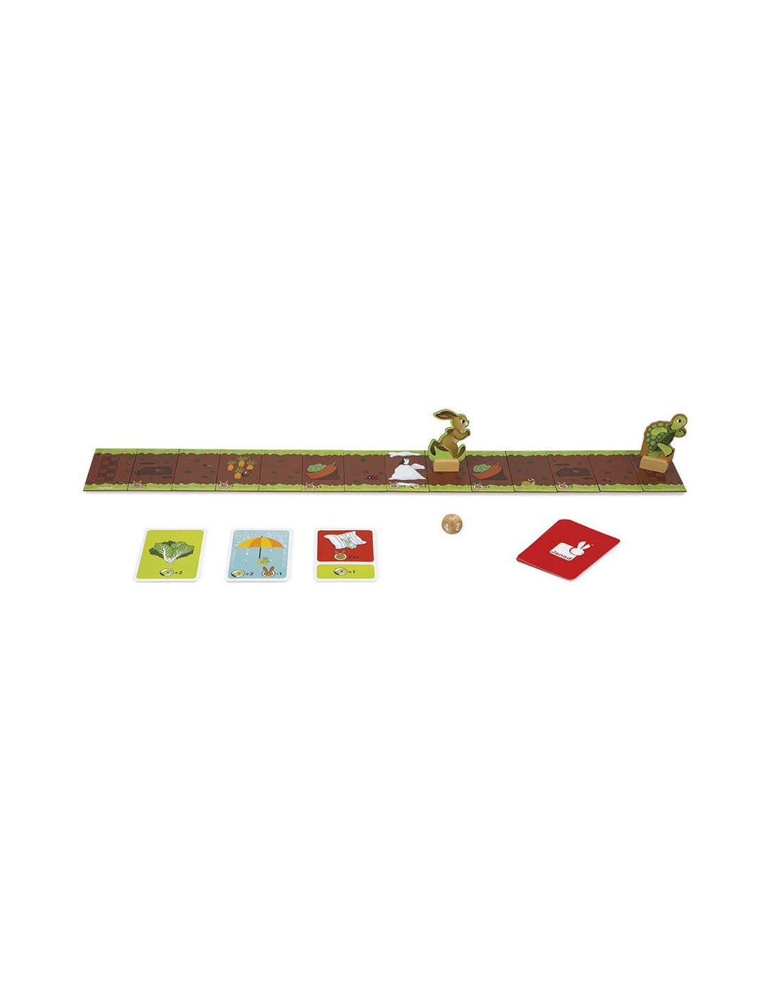 Juego de mesa sobre el tema de la famosa fábula de la liebre y la tortuga, ¡el jugador tendrá que llegar a la línea de meta antes que la liebre! Un juego en solitario para niños a partir de 6 años, que podrán jugar solos en esta increíble carrera loca. ¡El jugador encarna a la tortuga, más lenta pero más astuta que la liebre!