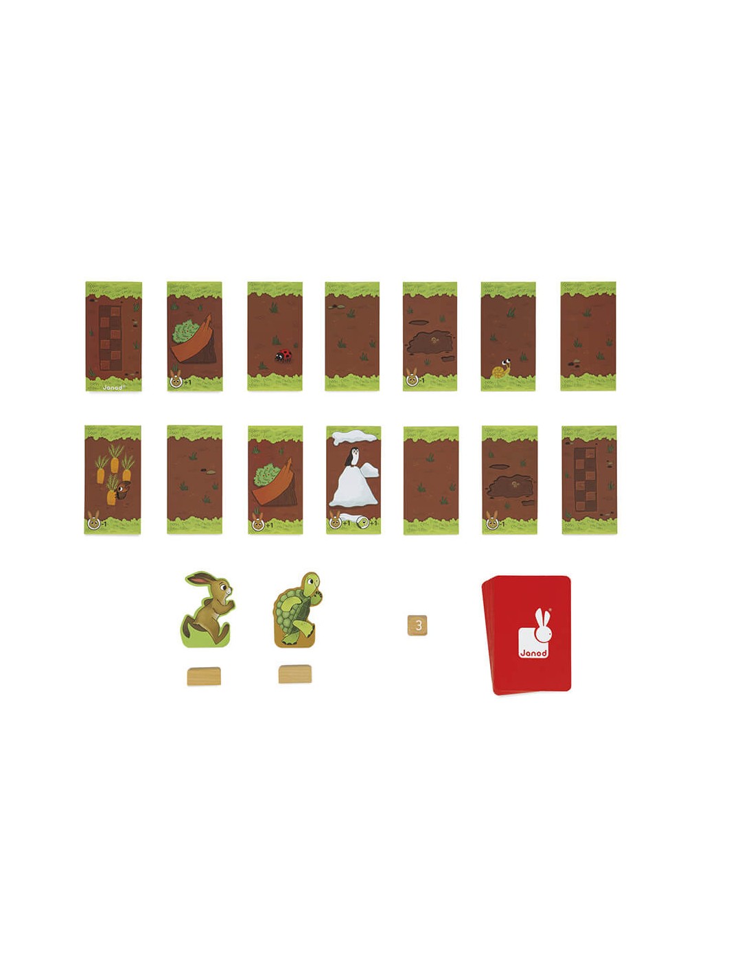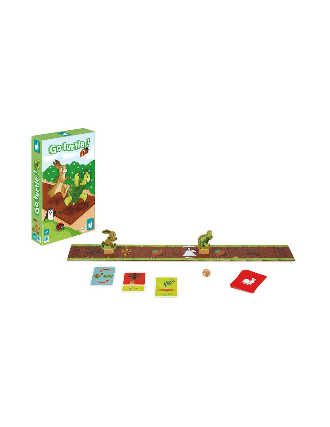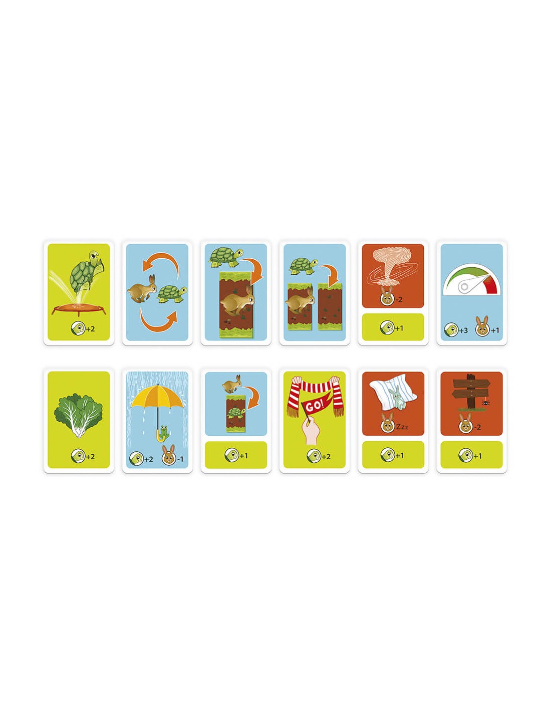 Juego de mesa sobre el tema de la famosa fábula de la liebre y la tortuga, ¡el jugador tendrá que llegar a la línea de meta antes que la liebre! Un juego en solitario para niños a partir de 6 años, que podrán jugar solos en esta increíble carrera loca. ¡El jugador encarna a la tortuga, más lenta pero más astuta que la liebre!