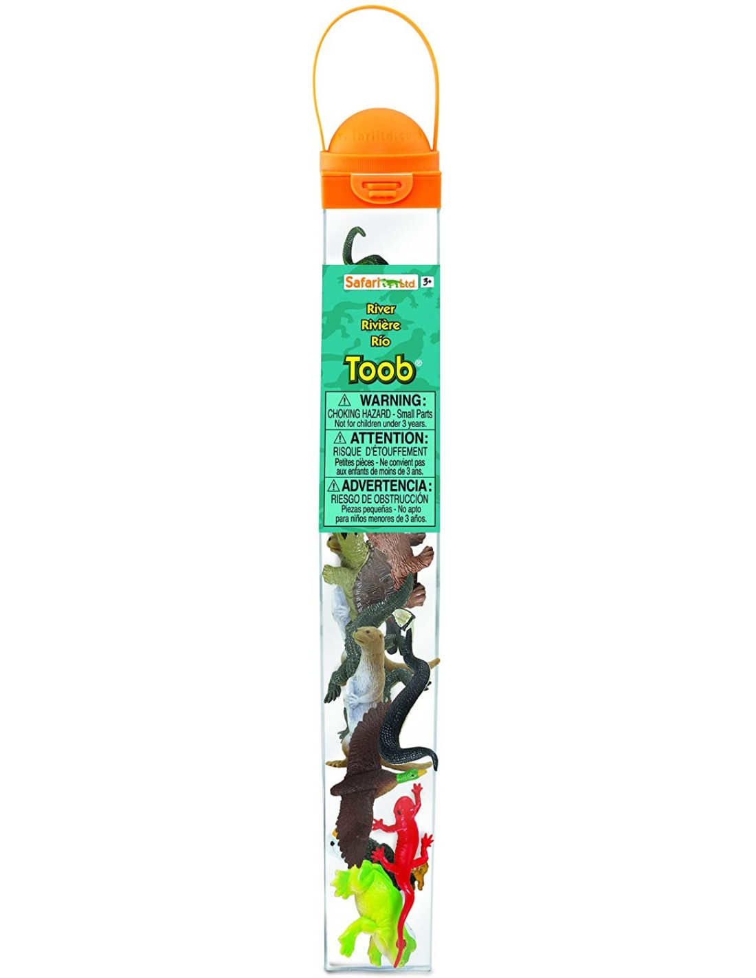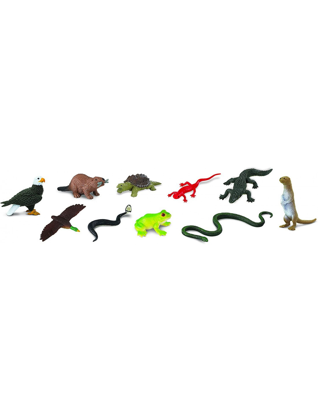 - Toob incluye: castor, águila calva, tortuga mordedora, salamandra, rana, serpiente, nutria de río, cocodrilo, serpiente de ánade real y boca de algodón