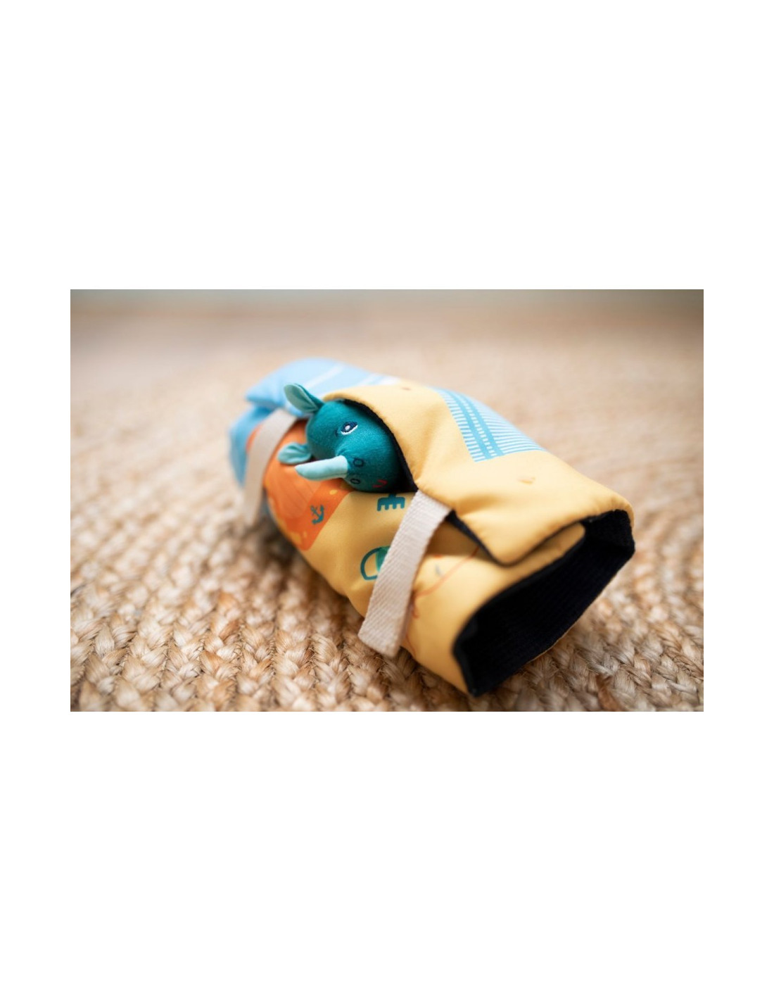 La familia de rinocerontes de peluche de la colección Marius de la marca Lilliputiens incluye tres pequeños peluches , el papá , la mamá y el pequeño Marius , y una colchoneta enrollable donde pueden dormir en sus cómodas camas después de un dia de playa .