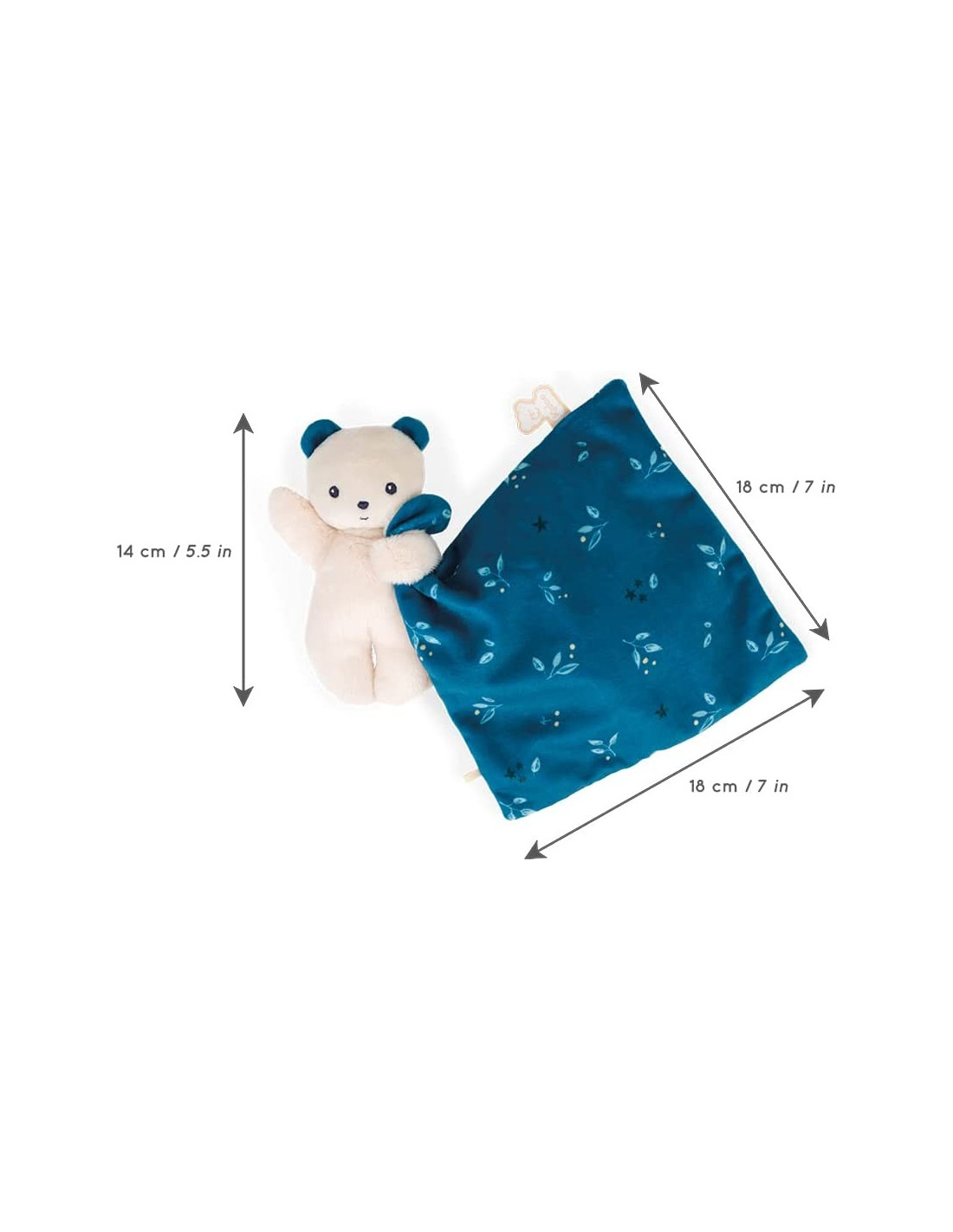 Peluche de la marca Kaloo formado por un oso de 14cm que sostiene en su mano una mantita cuadrada de 18 cm. Será el compañero más tierno de tu bebé que le acompañará a todas partes .