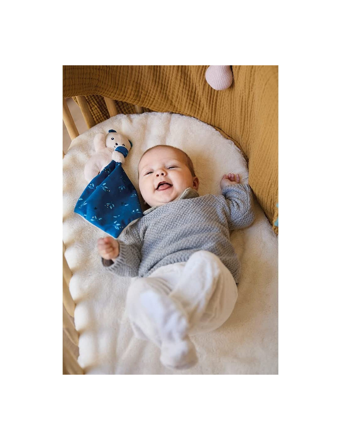 Gracias a su mullido cuerpecito de microterciopelo es fácil de agarrar y sostener por las manitos de los bebés . La mantita cuadrada tiene un estampado azul de medianoche con motivos inspirados en la naturaleza. Este estampado también se encuentra en las orejas combinándolo .