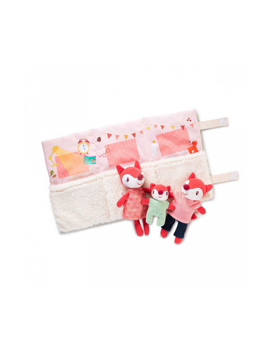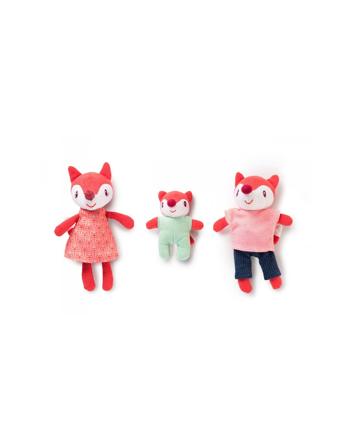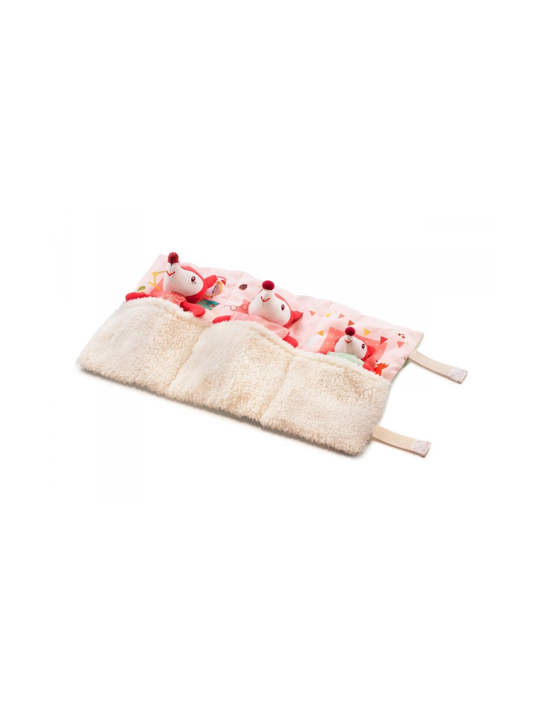 La familia de zorros de peluche de la colección Alice de la marca Lilliputiens incluye tres pequeños peluches , el papá , la mamá y la pequeña Alice, y una colchoneta enrollable donde pueden dormir en sus cómodas camas .
