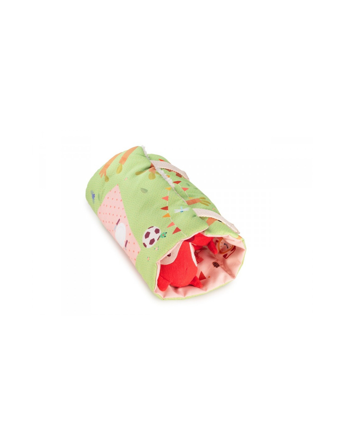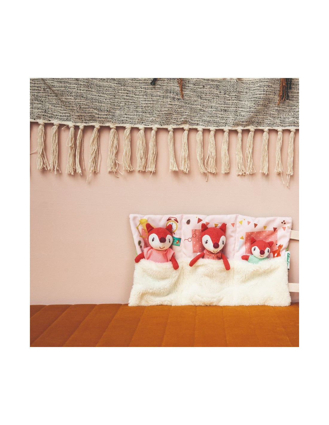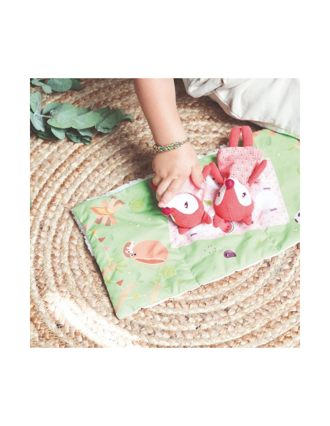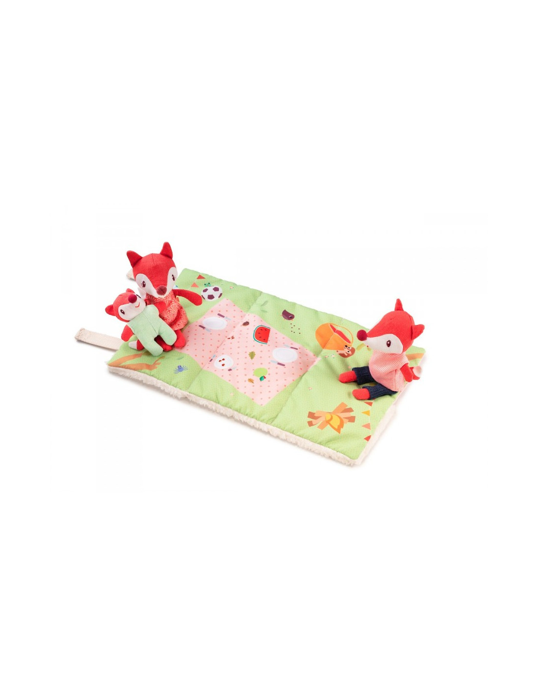 La familia de zorros de peluche de la colección Alice de la marca Lilliputiens incluye tres pequeños peluches , el papá , la mamá y la pequeña Alice, y una colchoneta enrollable donde pueden dormir en sus cómodas camas .