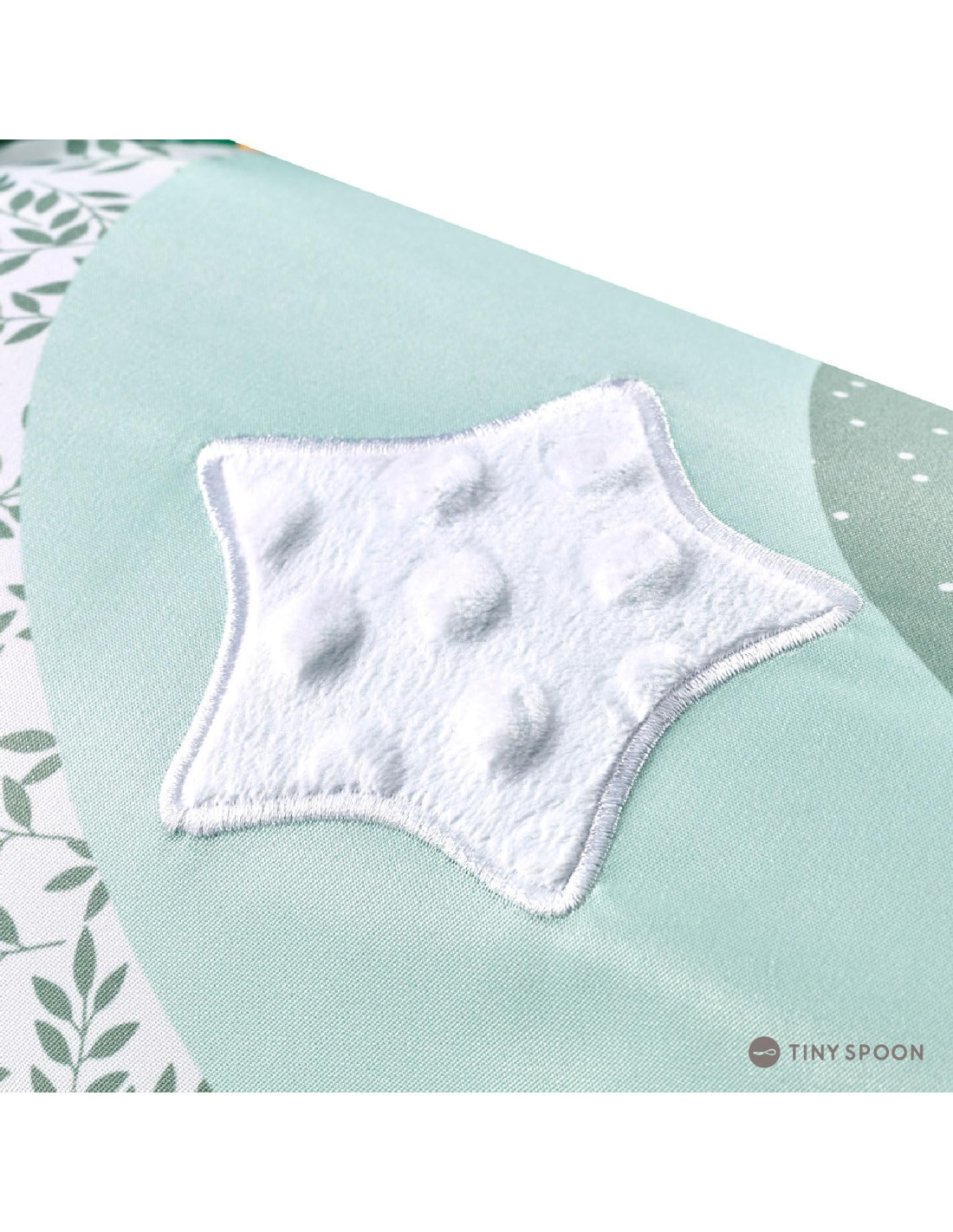 Tiene varias actividades por descubrir para despertar los sentidos del bebé : 1. Un espejo . 2. Etiquetas para manipular . 3 . Bolas sonoras y un cascabel dentro del rodillo para hacer que suene . 4. Un sonajero para agitar , para escuchar cómo las bolas chocan entre sí . 5. Papel arrugado en las hojas para jugar con los sonidos crepitantes . 6. Una parte texturada de material flexible y blando para morder . 7. Diversas texturas y materiales por descubrir .