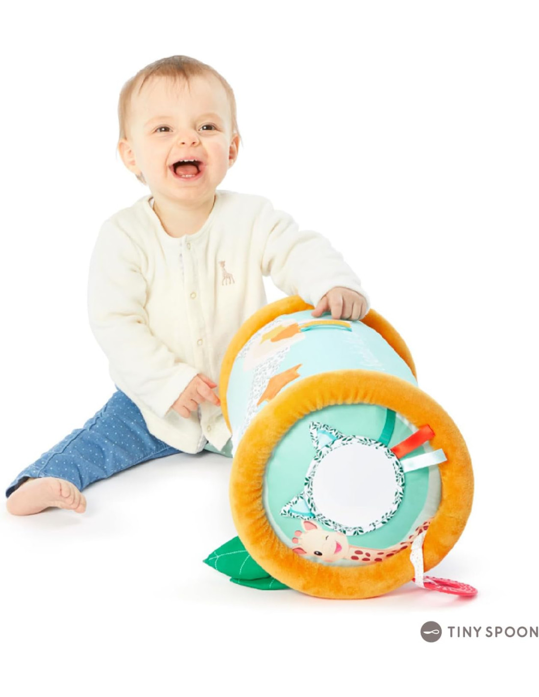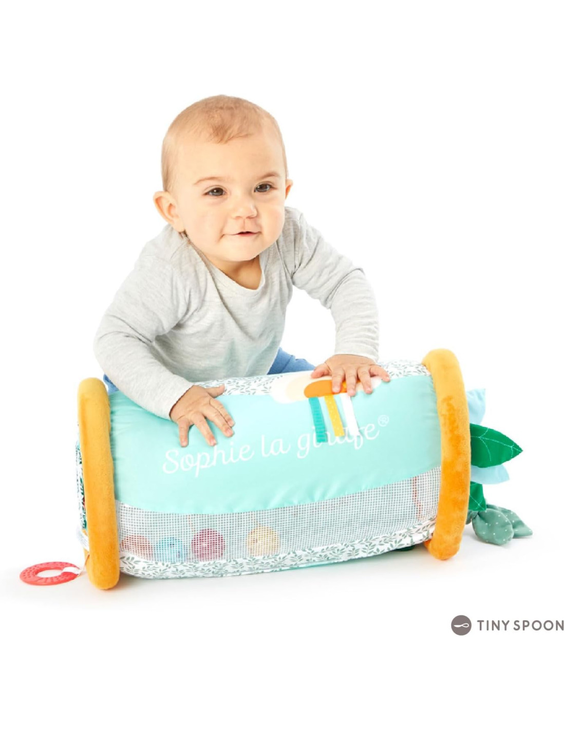 Rodillo de actividades hinchable para bebés Rollin´de Sophie La Girafe , un rodillo de escalada para hacerlo rodar y montarse en él para desarrollar la motricidad , el equilibrio, la coordinación y la imaginación del bebé . Un juguete educativo y divertido que estimula los sentidos de los más pequeños .