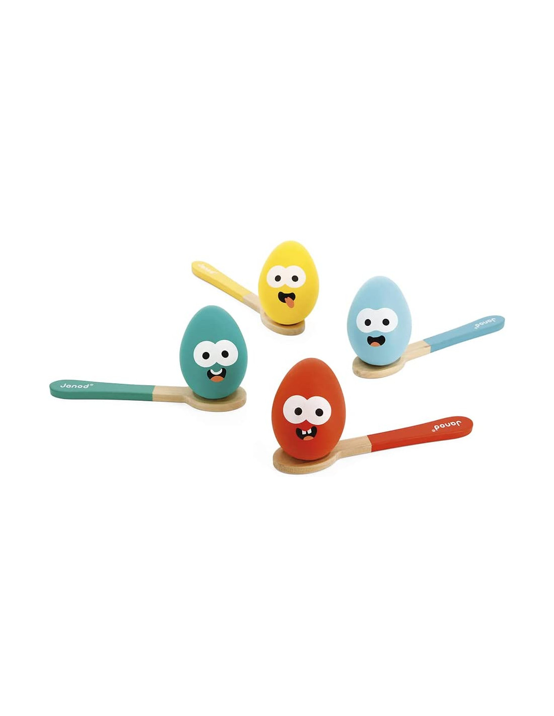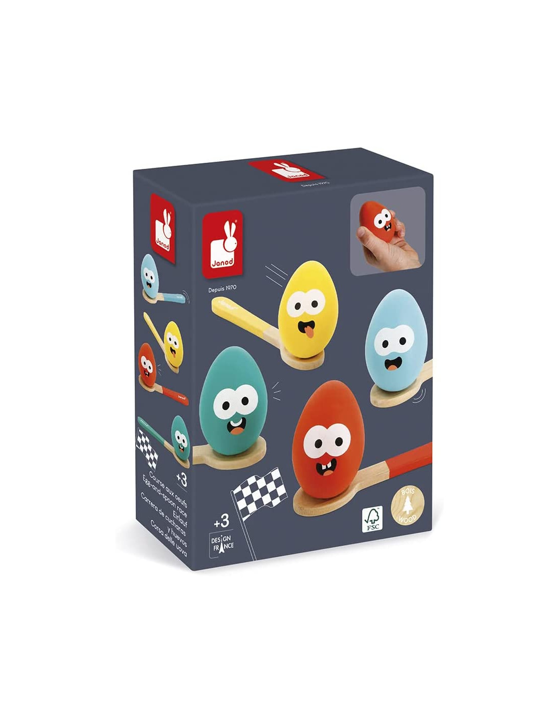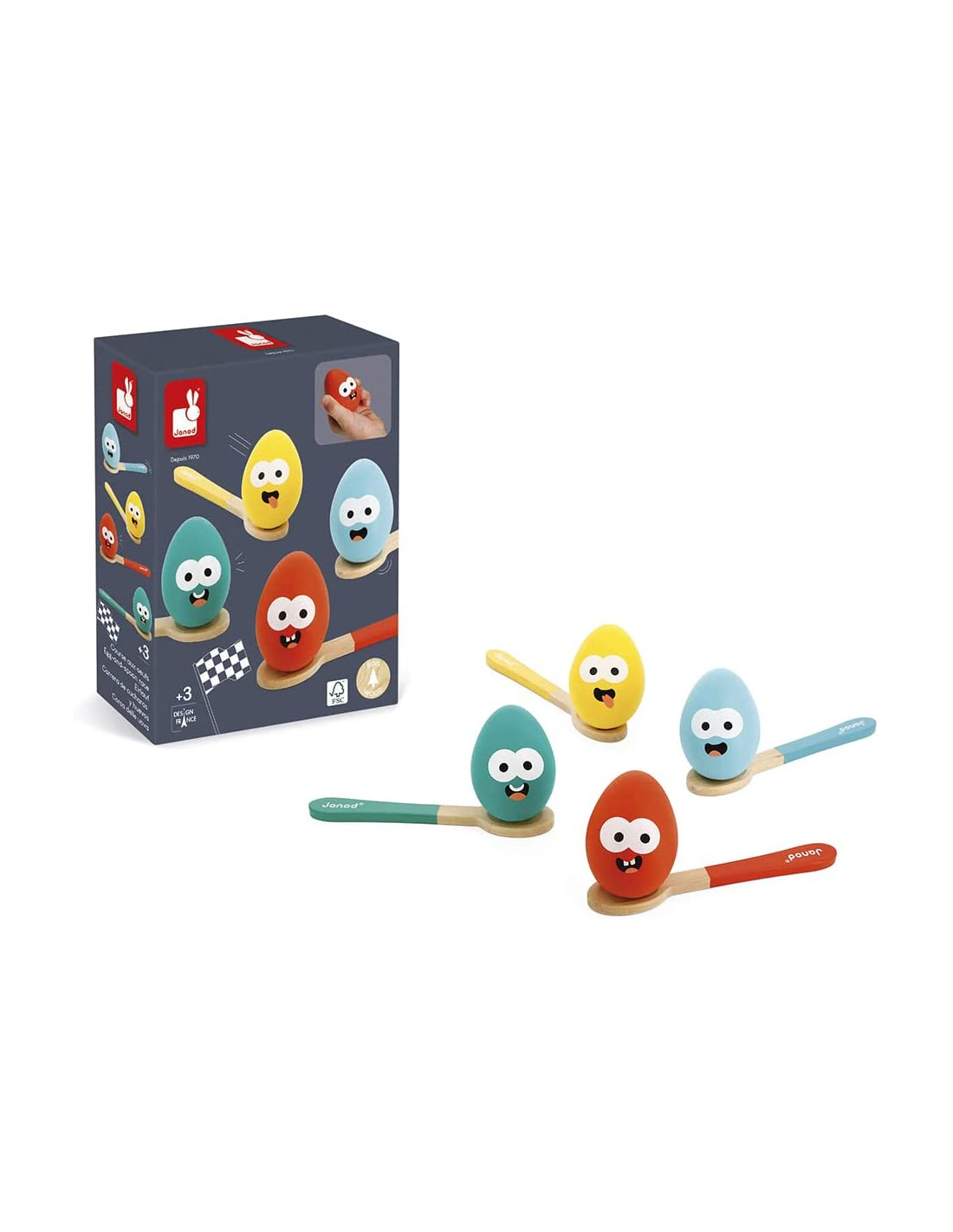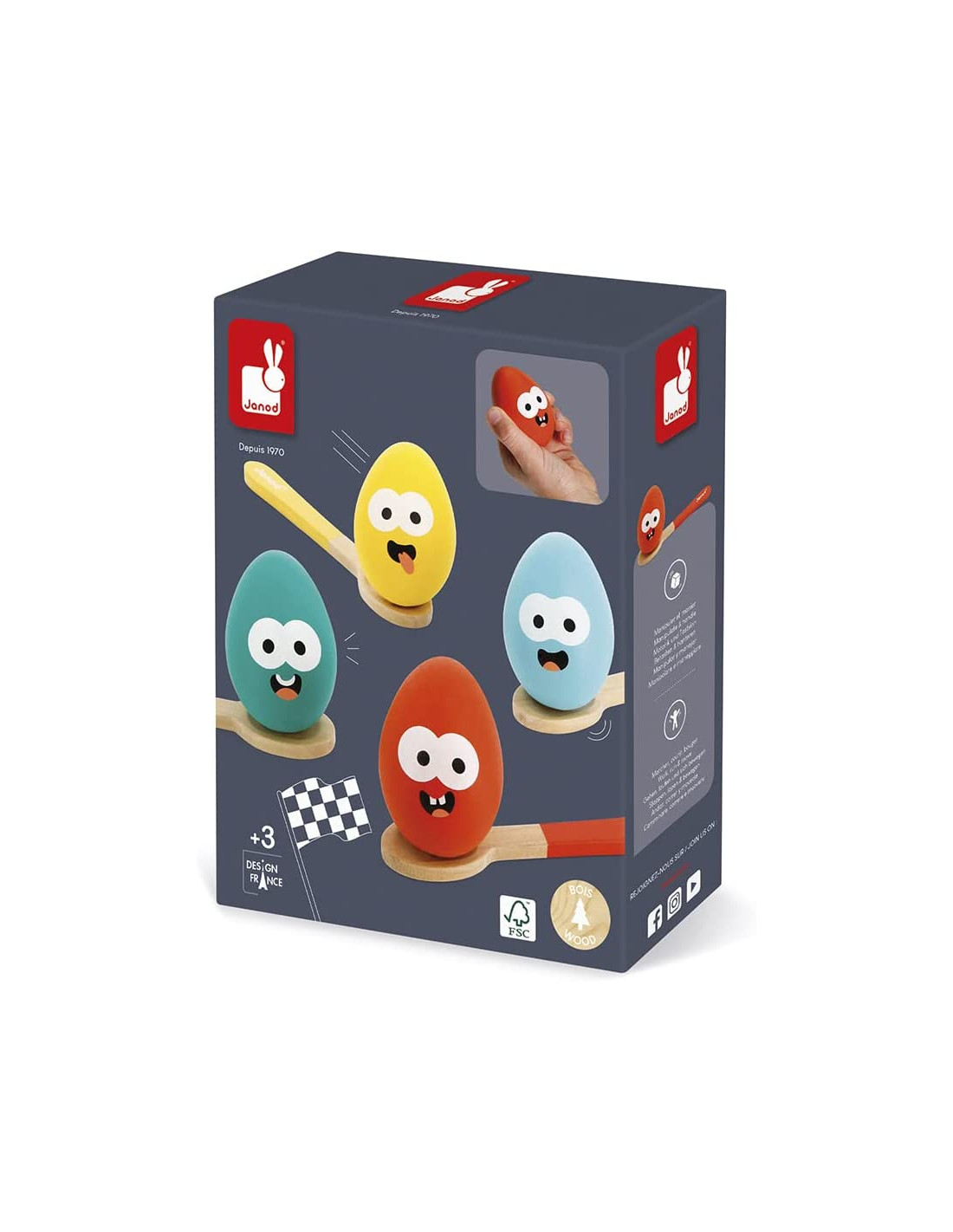 La carrera de huevos en cucharas de la marca francesa JANOD es muy divertida para toda la familia. Las cucharas de madera tienen mangos de colores brillantes que combinan con los colores de los huevos, y además están decoradas con caras divertidas. El objetivo del juego es llegar a la meta sin dejar caer el huevo de la cuchara por el camino. Este es un gran juego perfecto para juegos al aire libre, como picnics o fiestas de cumpleaños.