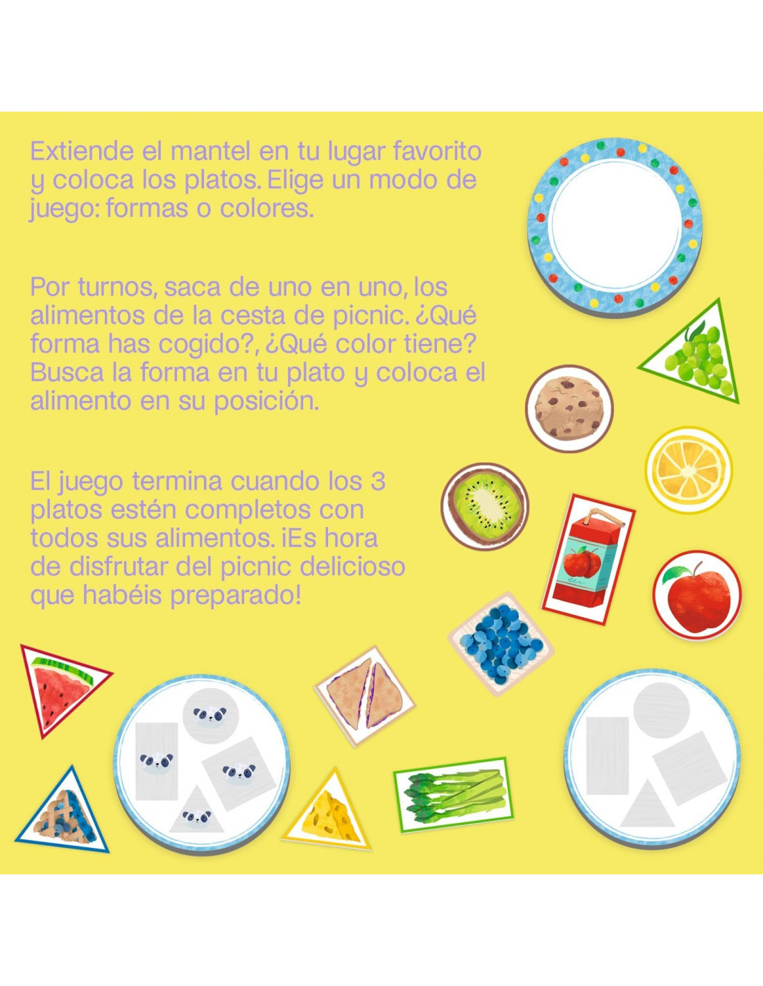Para jugar extiende el mantel en tu lugar favorito y coloca los platos. Elige un modo de juego: formas o colores.
