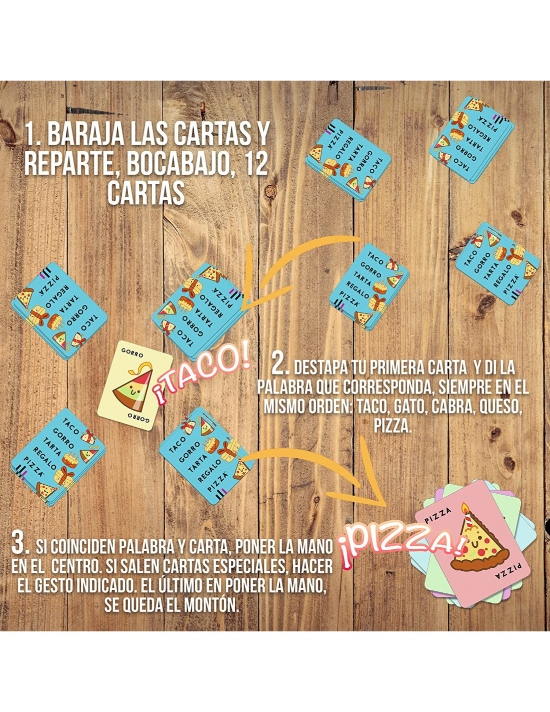 Para jugar baraja las cartas y reparte bocabajo 12 cartas para cada uno de los jugadores, y se descartan las cartas sobrantes. Los jugadores no miran sus cartas.Un jugador destapa la primera carta de su mano y dice la palabra que corresponda, siempre en el mismo orden: Taco, Gorro, Tarta, Regalo, Pizza .Si coinciden palabra y carta, los jugadores ponen la mano al centro. Si salen cartas especiales hay que hacer el gesto indicado. El último en ponerla, se queda el montón .En las cartas del Unicornio, el Mono y el Ninja, todos tendrán que hacer el gesto correspondiente. El último en reaccionar y hacerlo se llevará todo el montón de cartas
