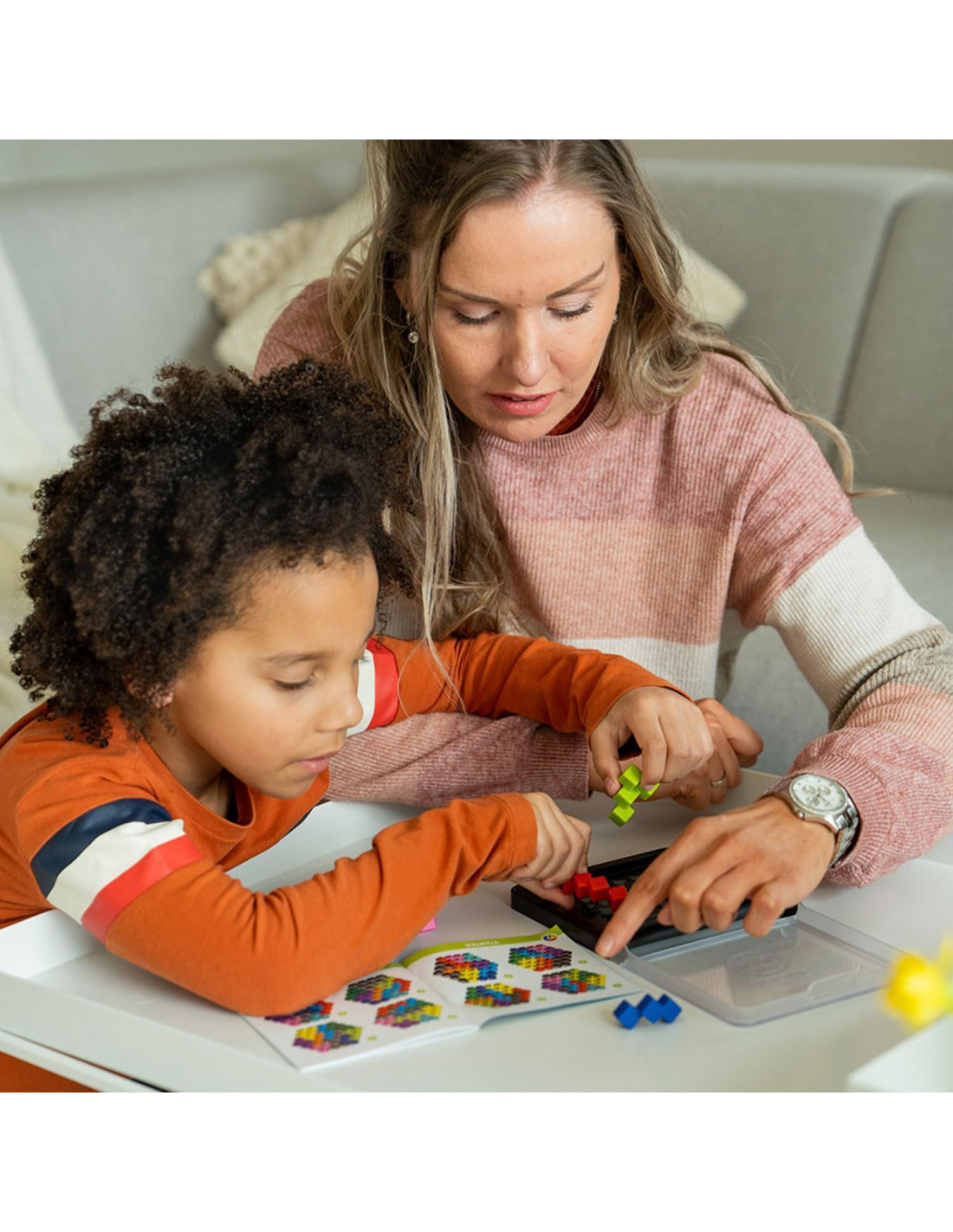 Contiene un tablero de juego compacto con tapadera transparente , 10 piezas de rompecabezas con forma de cubo de diferentes colores , libro con 120 retos y soluciones .