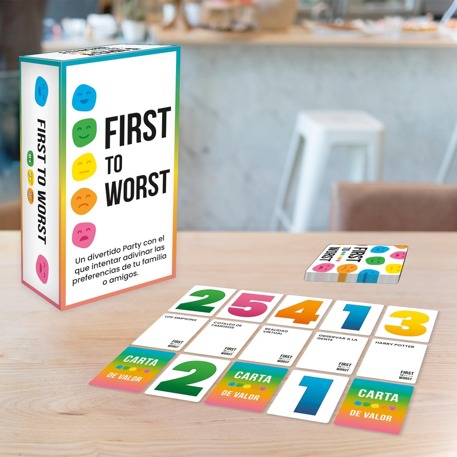 😄🎲🔝 ¡Bienvenido a First to Worst! En este emocionante juego de mesa cooperativo, tendrás que demostrar tus habilidades para adivinar las preferencias de tus amigos y familiares. ¿Podrás conseguir más aciertos que errores y alzarte con la victoria?