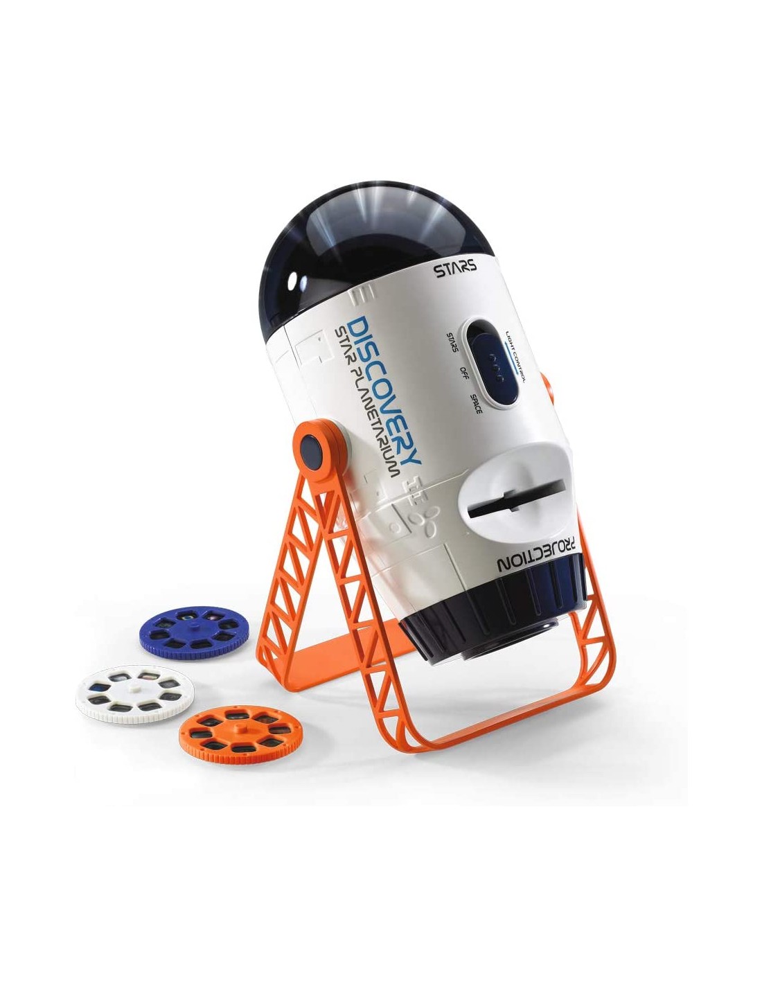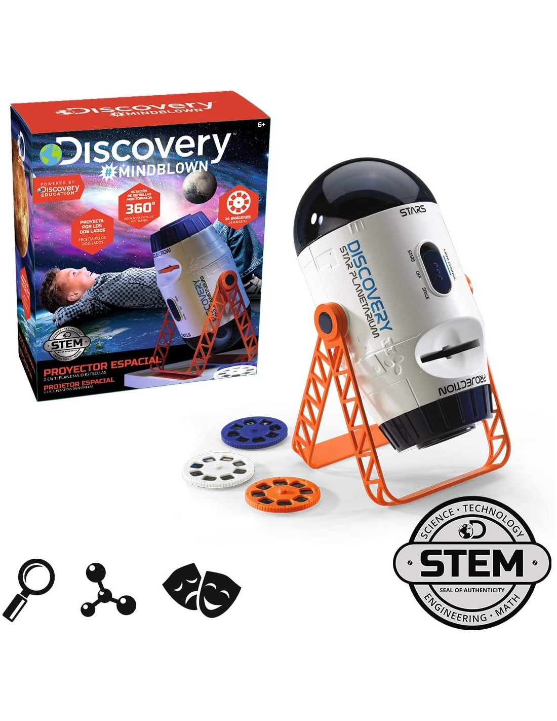 Lampara proyector que proyecta por un lado, estrellas que rotan lentamente. Por el otro lado, proyecta imágenes de planetas, constelaciones y galaxias.