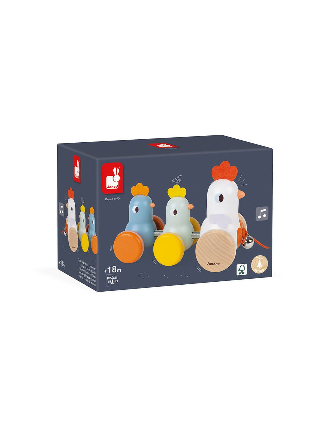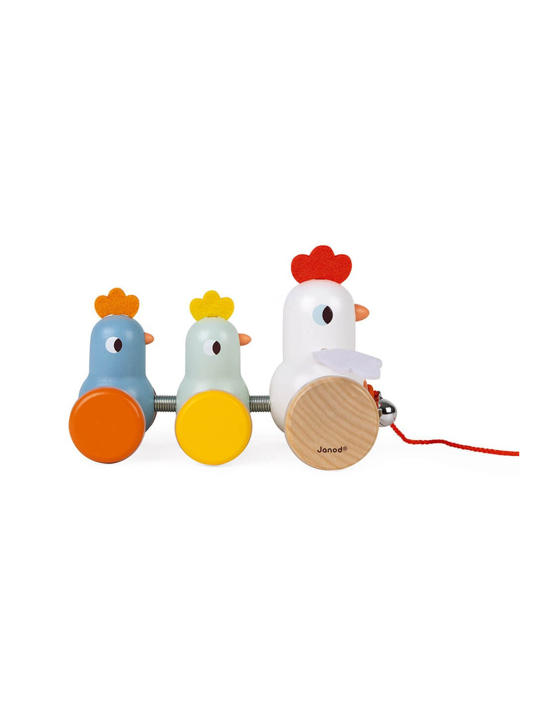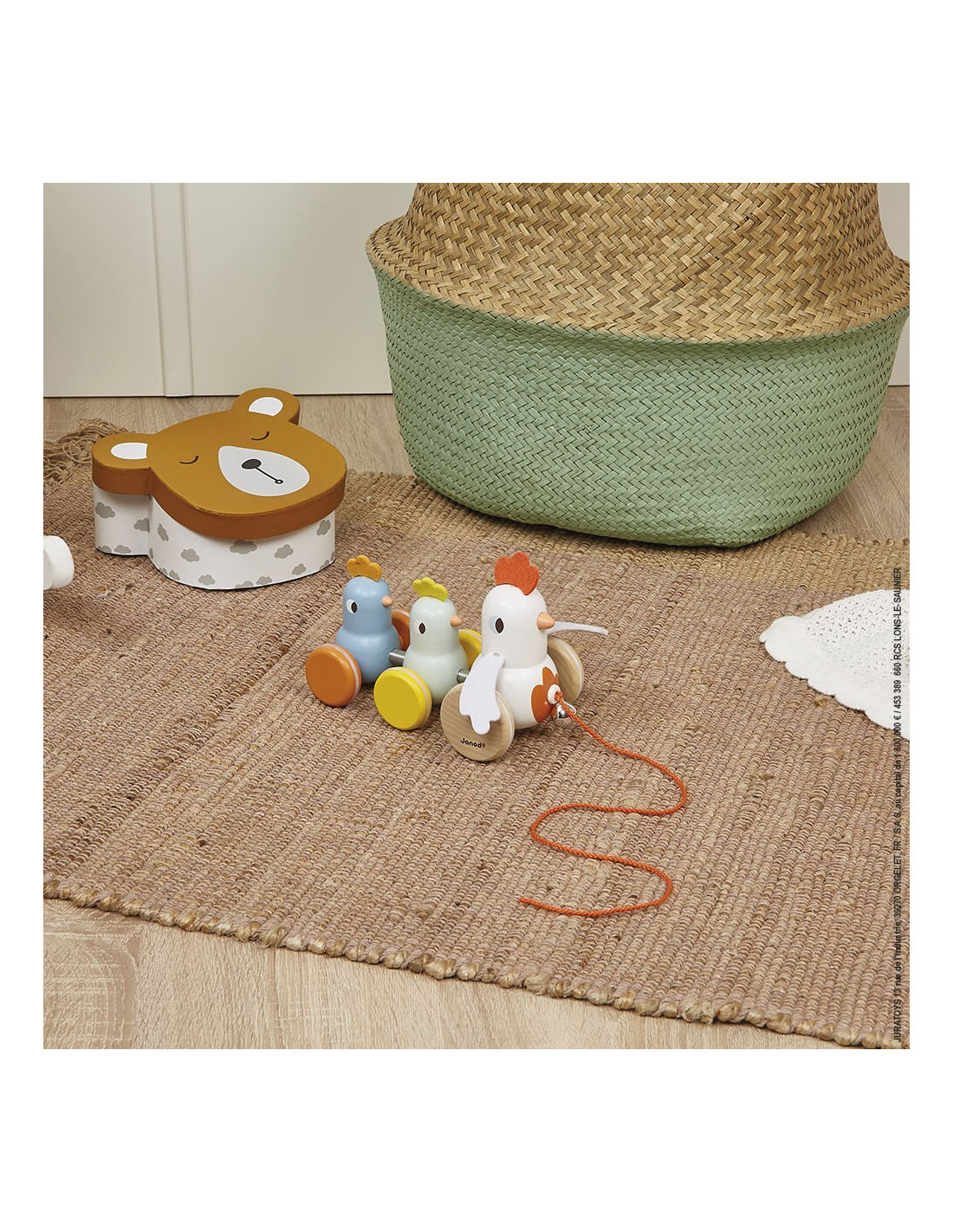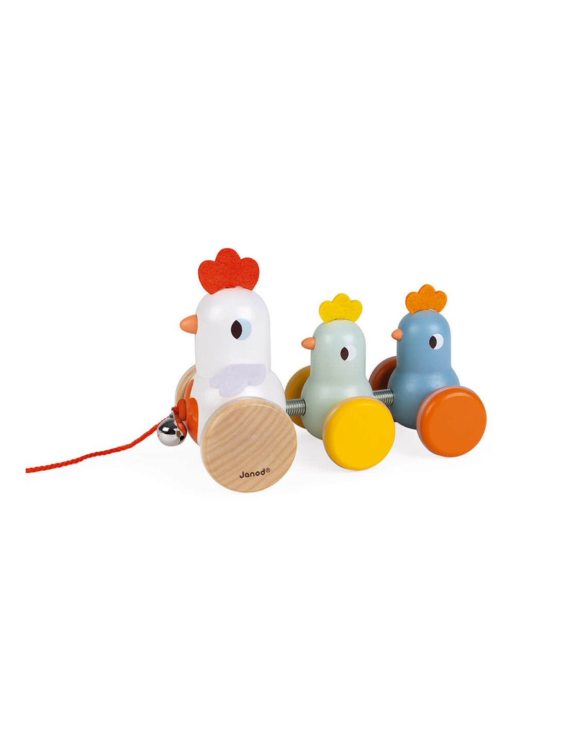 Juguete de arrastre de madera de la mama gallina y sus pollitos. Estimulará la motricidad de los niños y los motivará a caminar mientras pasean a esta familia de animalitos tirando de la cuerda . A la vez que se divertirán escuchando el cascabel que tintinea a la vez que caminan.