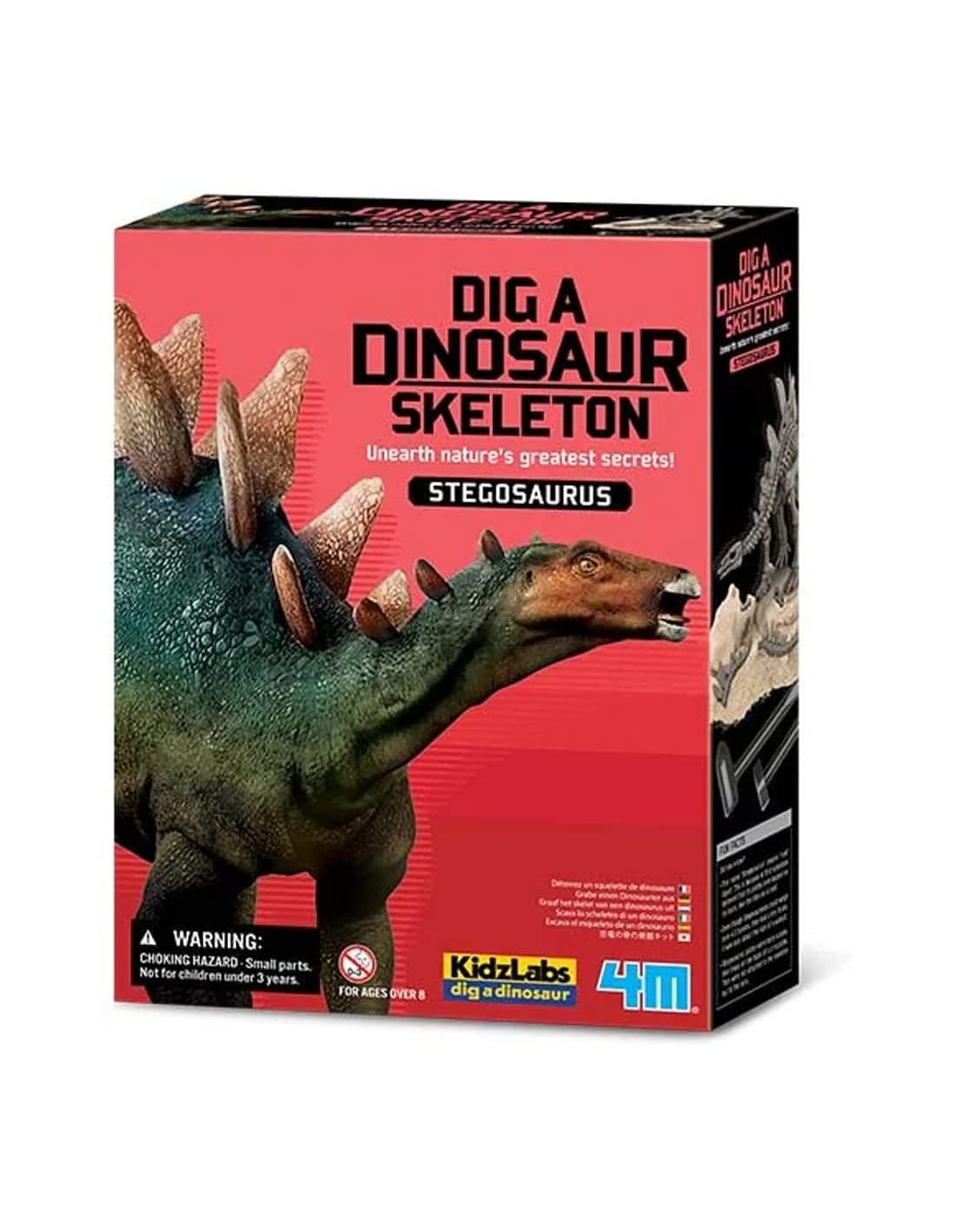 Kit que contiene un esqueleto de Stegosaurus escondido en un bloque de yeso que los niños tendrán que excavar para descubrirlo .