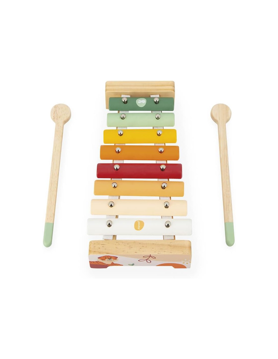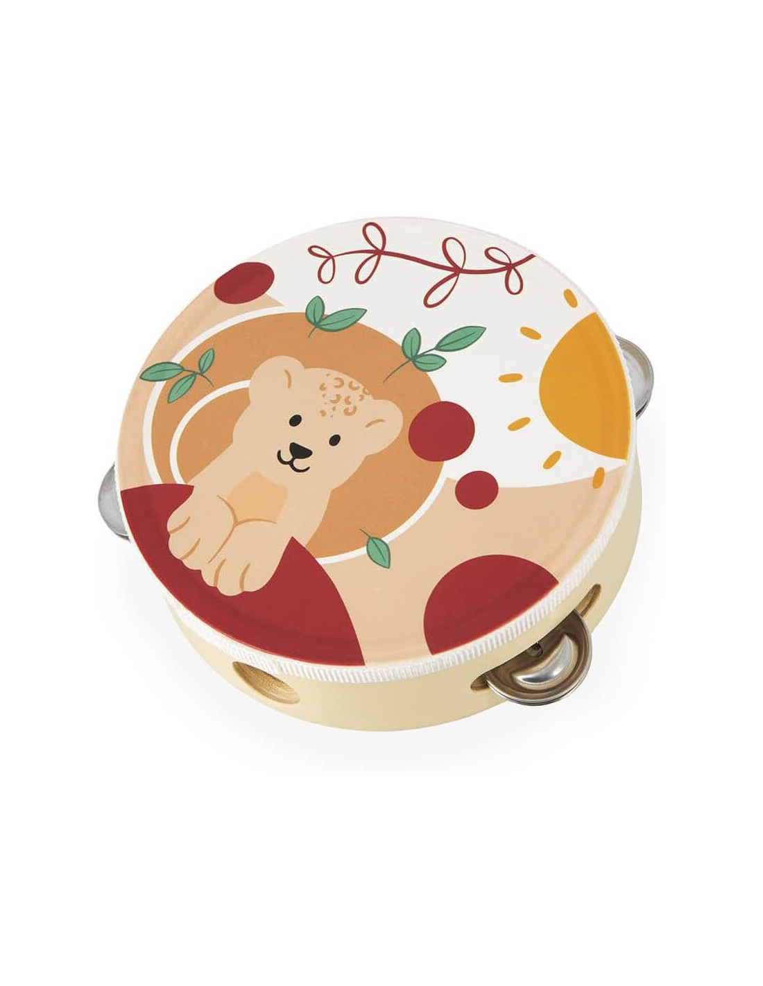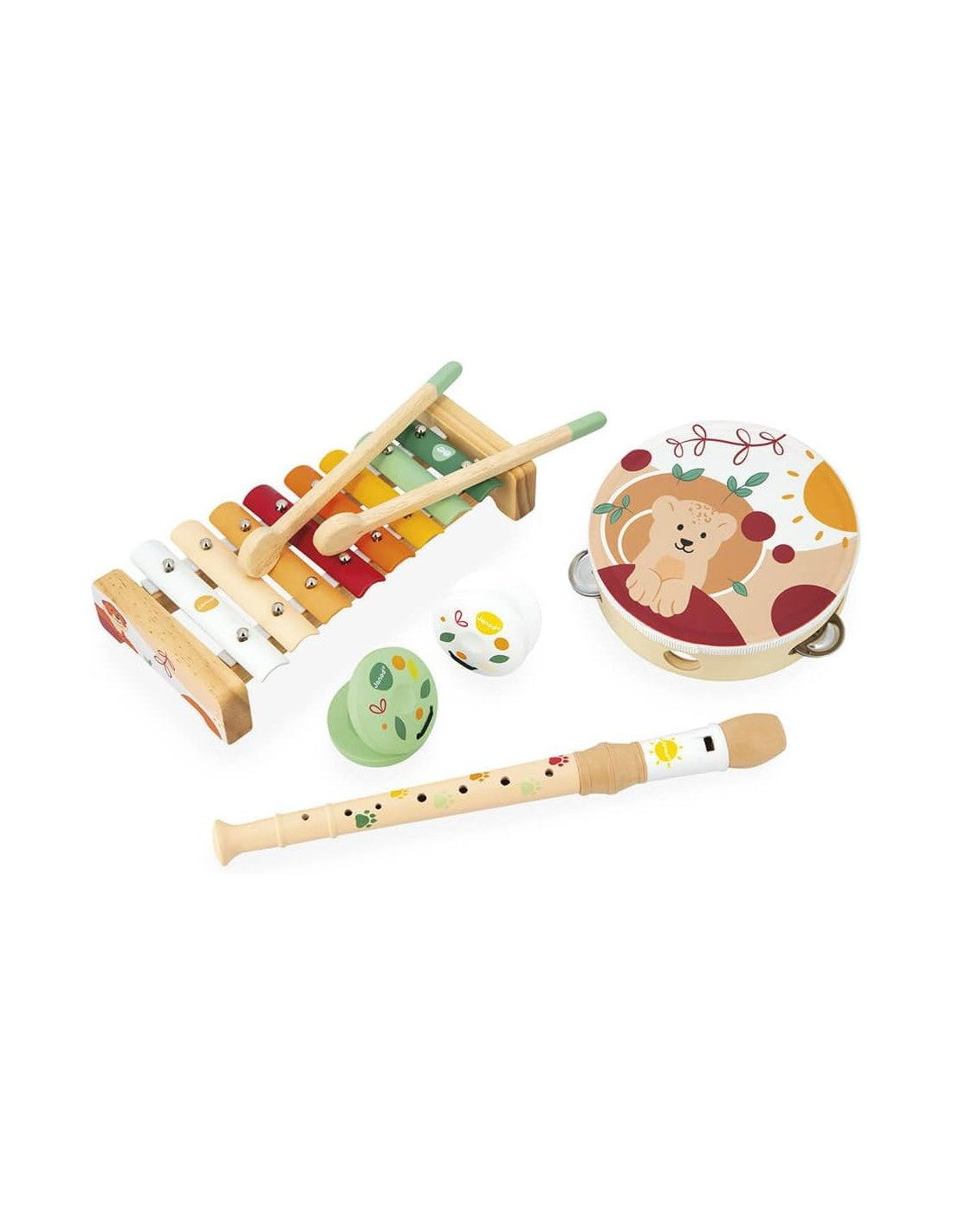 El xilófono es metálico con 8 tonos y sus dos baquetas de madera , la pandereta está decorada con el dibujo del león Leo , la flauta de madera decorada con las huellas de nuestro amigo Leo , y las dos castañuelas una en verde y otra en color blanco .
