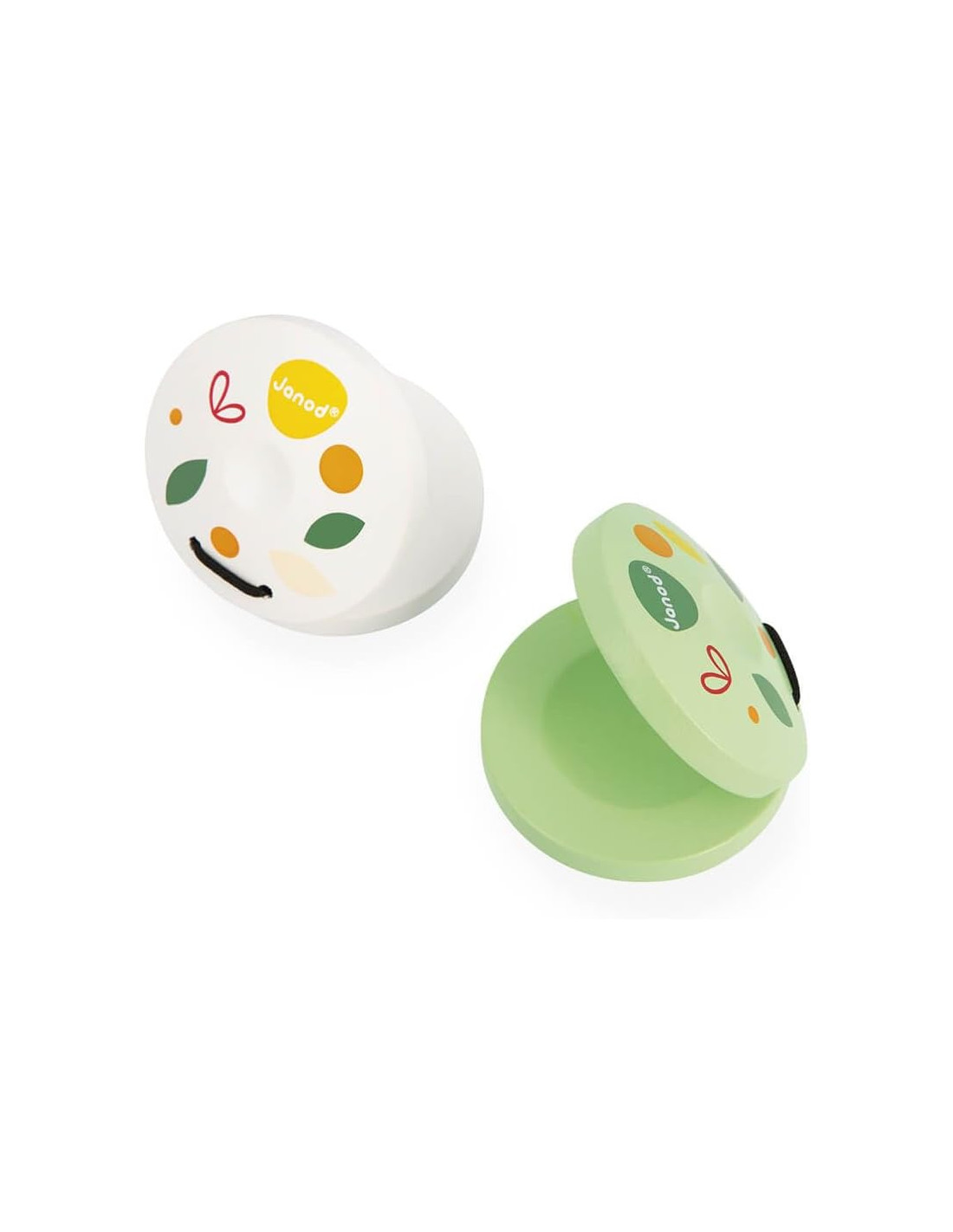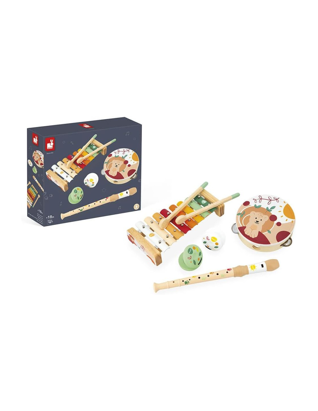 Kit 5 instrumentos musicales de Janod fabricados en madera y diseñados con colores cálidos y agradables . El conjunto musical incluye un xilófono , una pandereta , una flauta y dos castañuelas .