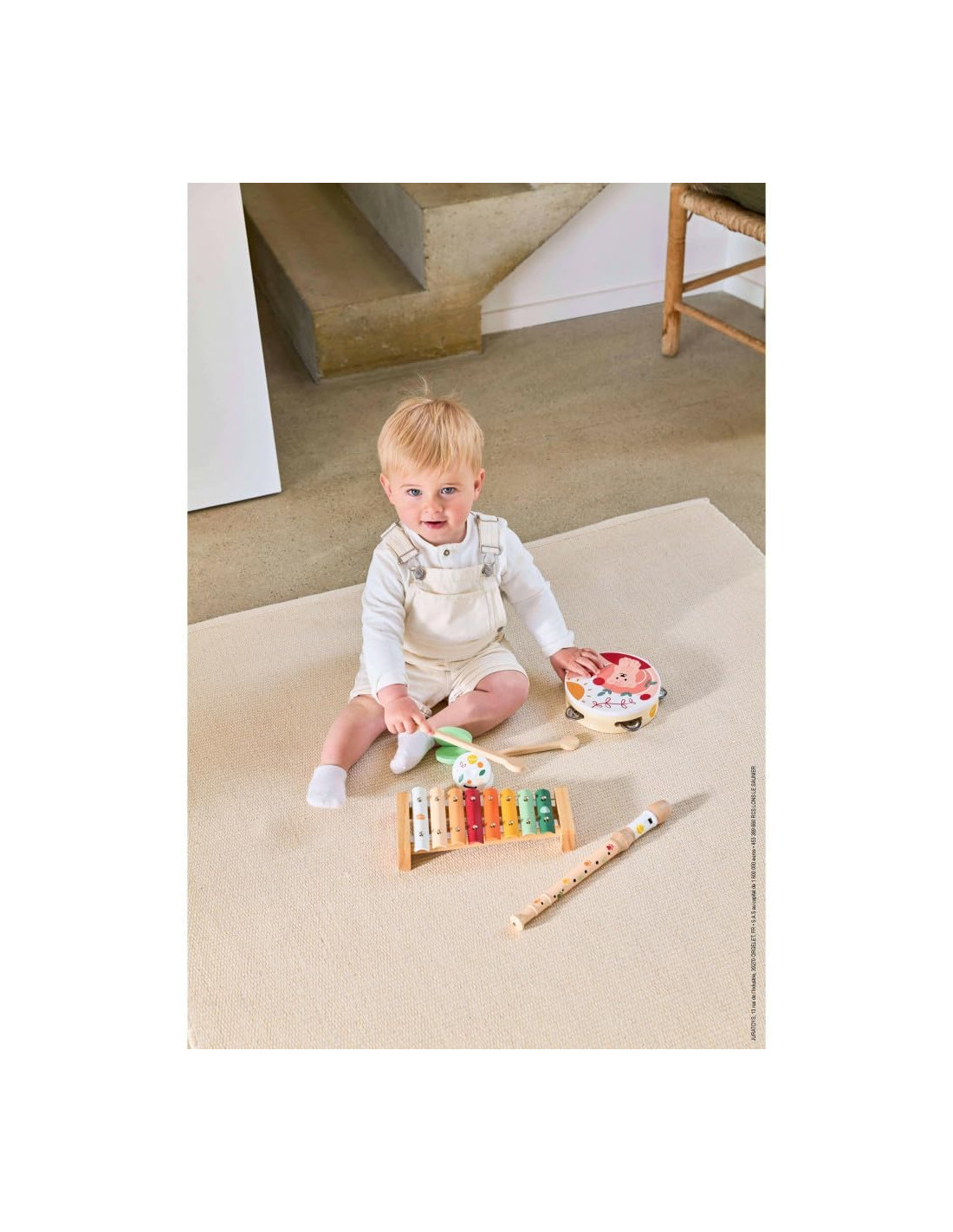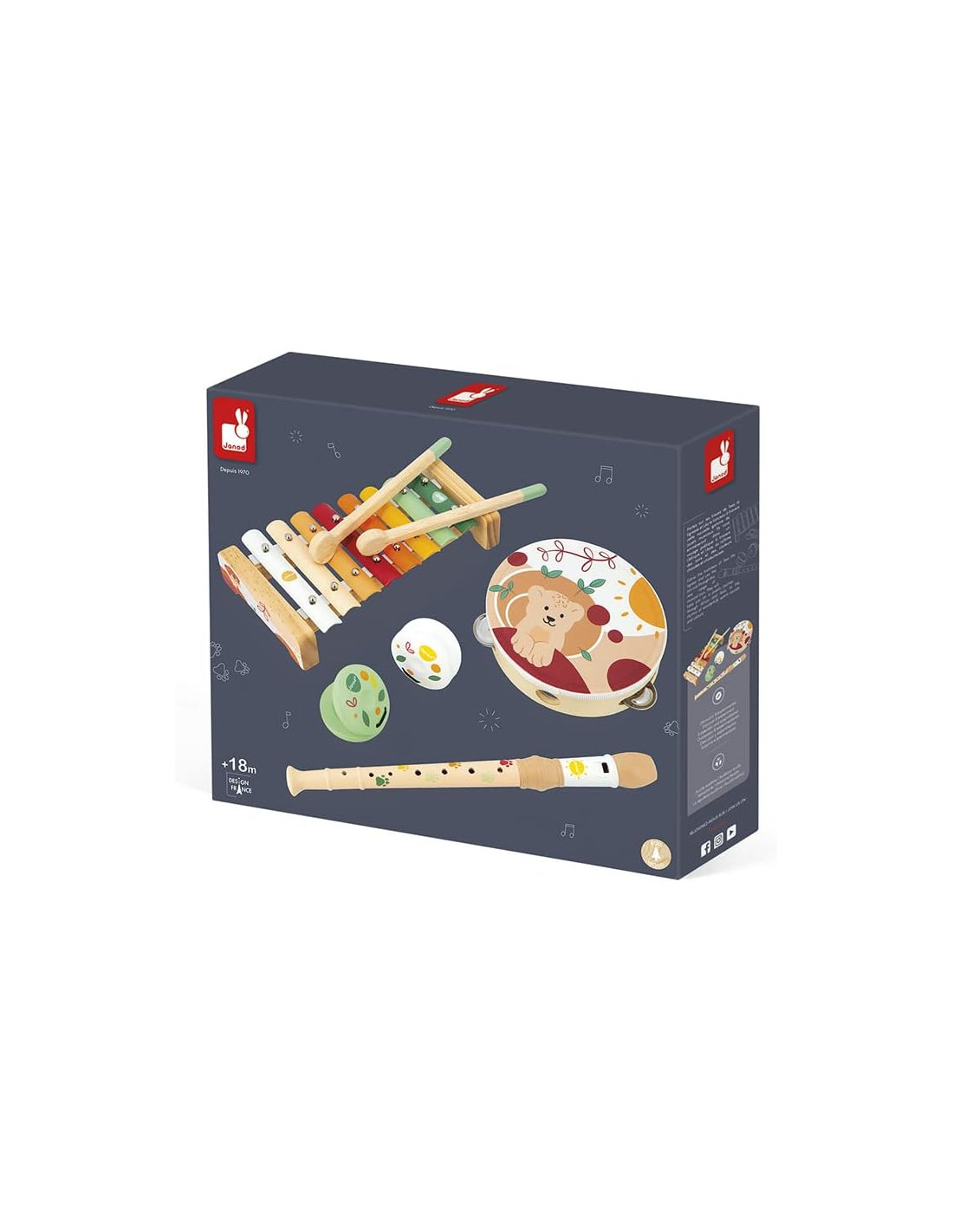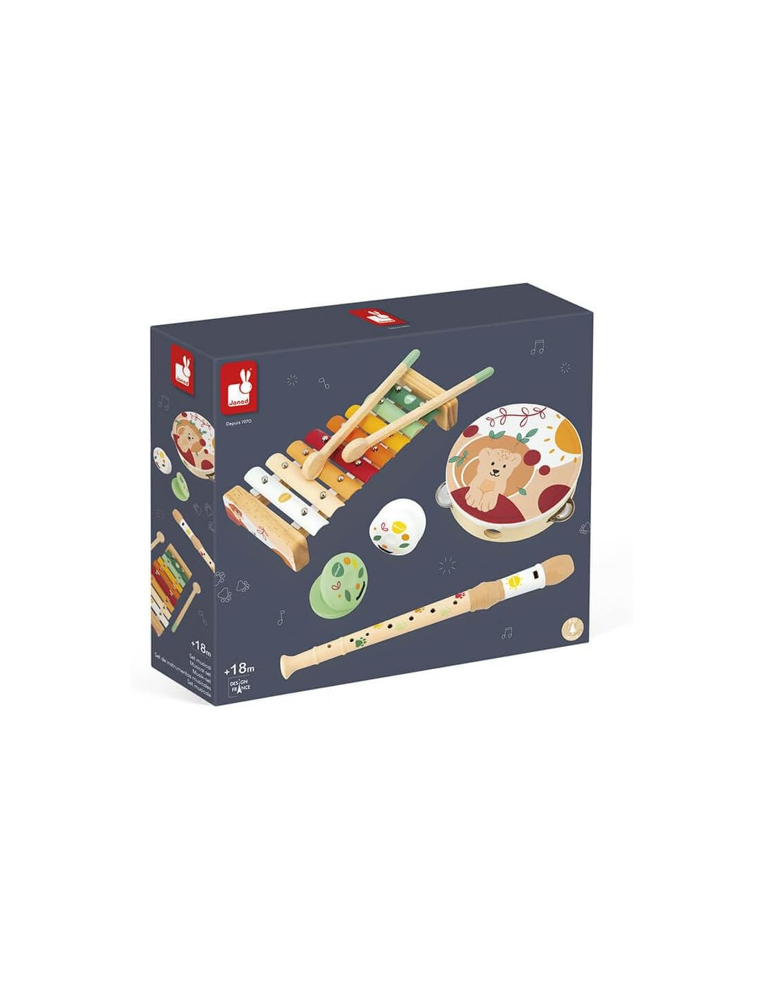 Conjunto de 5 instrumentos musicales de la colección Sunshine de Janod , que incluye un xilófono , una pandereta , una flauta y dos castañuelas . Instrumentos adaptados a las manos de los más pequeños , con los que desarrollarán su creatividad , su coordinación y su sentido del ritmo a la vez que se divierte .