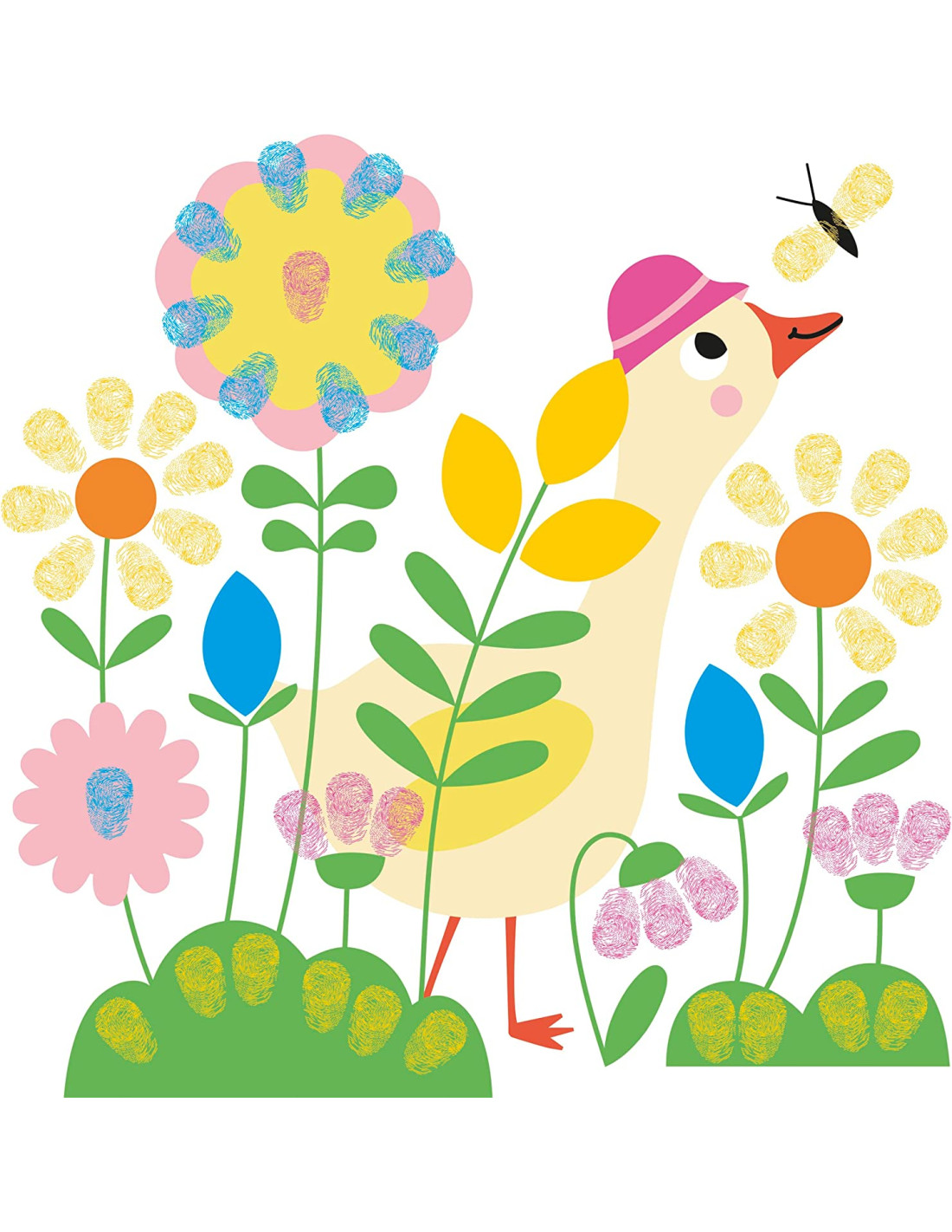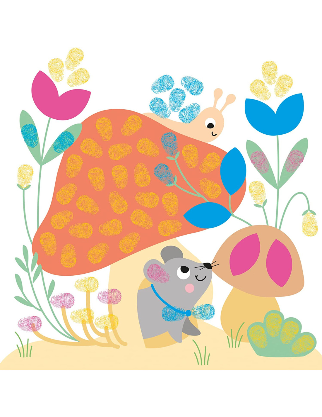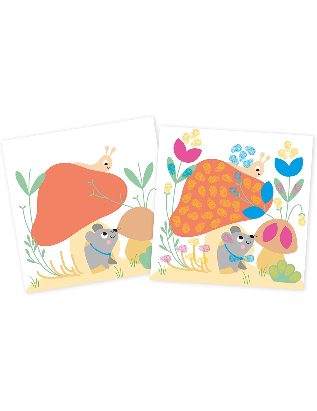 Estuche multiactividades para niños a partir de 3 años , que podrán completar 4 cuadros con tintas de dedos y 1 tampón , así como 4 cuadros coloreándolos con un rotulador de agua .