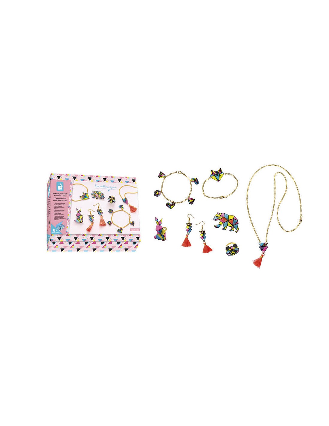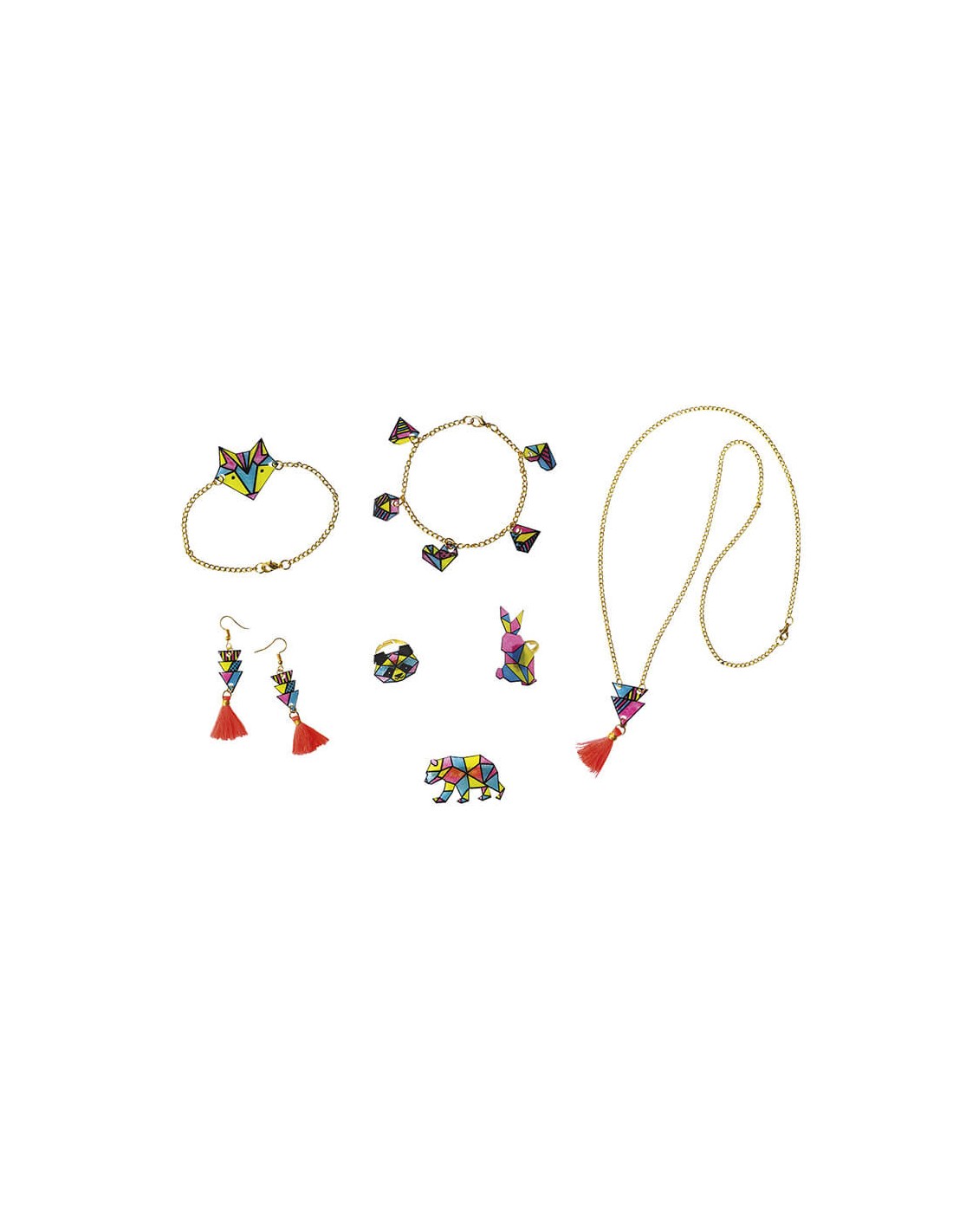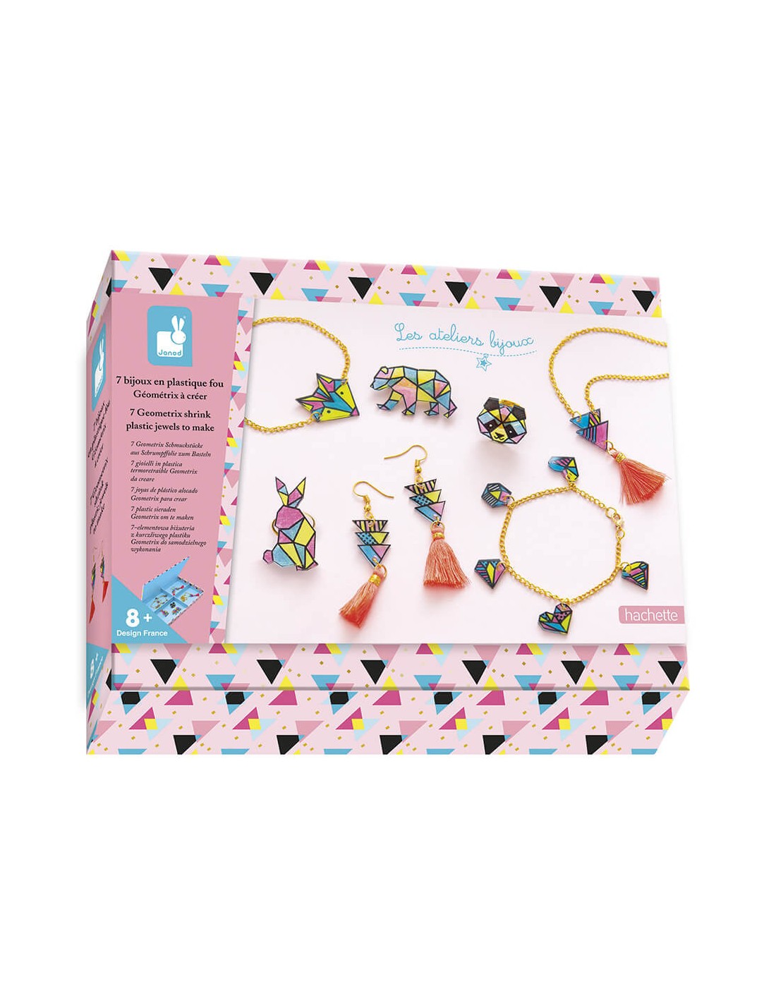 Kit creativo mi joyero Geometrix de la marca francesa Janod , que te permitirá crear un total de 7 piezas de joyería : 2 pulseras , un collar , un broche , 2 anillos y un par de pendientes .