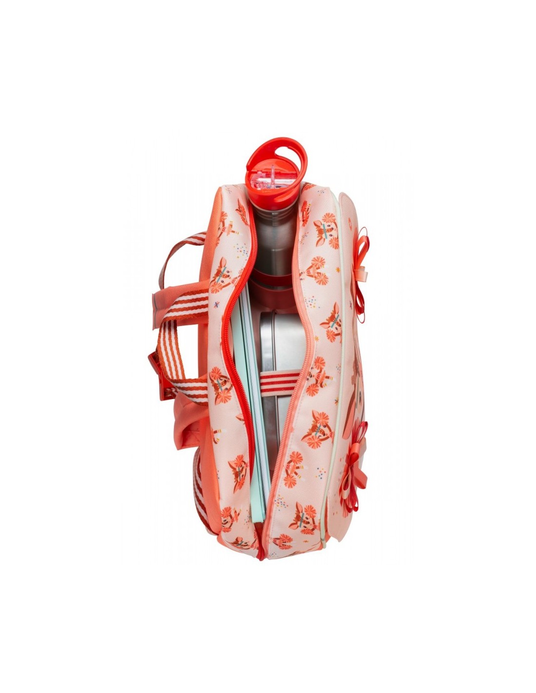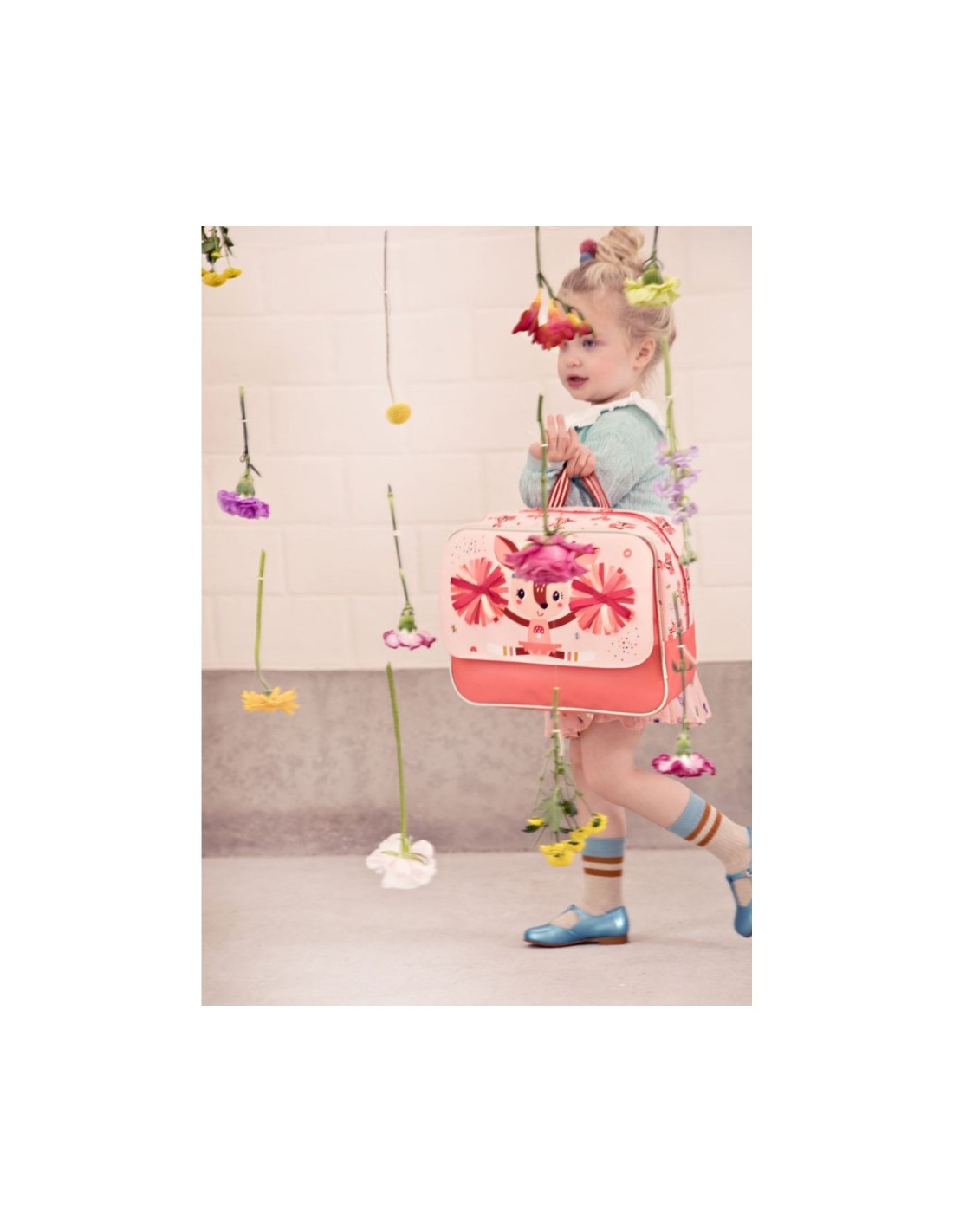 Cartera muy práctica con un bolsillo delantero, un gran bolsillo interior y una banda elástica para mantener la botella de agua en posición vertical en la cartera. Una magnífica mochila escolar con bonitas telas en los pompones de la niña Pom Pom Stella, que se mueven cuando el niño se mueve. Carpeta que puede contener un cuaderno de 24 x 32 cm.