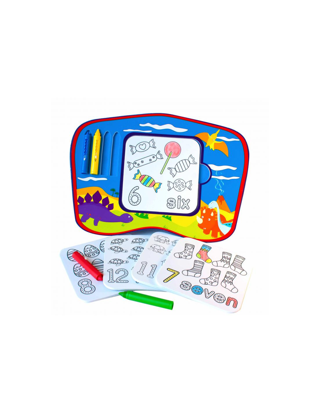 La pizarra de dibujo cuenta con doce fichas con diferentes personajes y objetos, cada una representando un número del 1 al 12. Los niños pueden elegir una de las fichas, colocarla en la pizarra y contar las imágenes que aparecen en ella. Luego, podrán escribir el número correspondiente en la pizarra y colorear la ficha, fomentando así la creatividad y la coordinación mano-ojo.