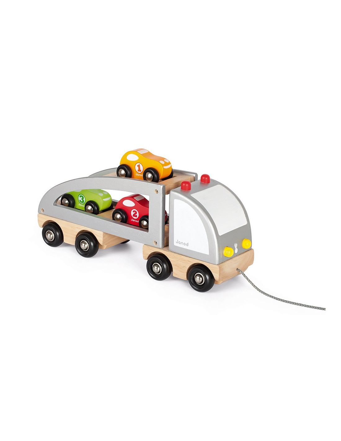 ¡Incluye 3 bólidos increíblemente rápidos para poder organizar carreras desenfrenadas!...El bebe podrá remolcar los coches en el camión. Ideal para desarrollar la destreza manual de su bebe. Realizado en madera de hevea y ciprés, incluye cordel de algodón.