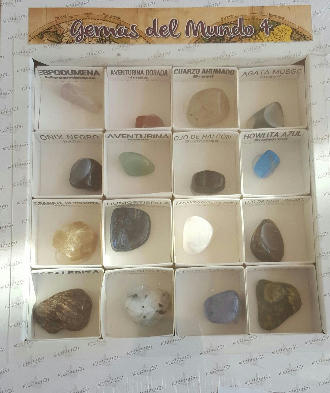 Expositor de cartón con 16 minerales de tamaño mediano,etiquetadas con el nombre del mineral y...
