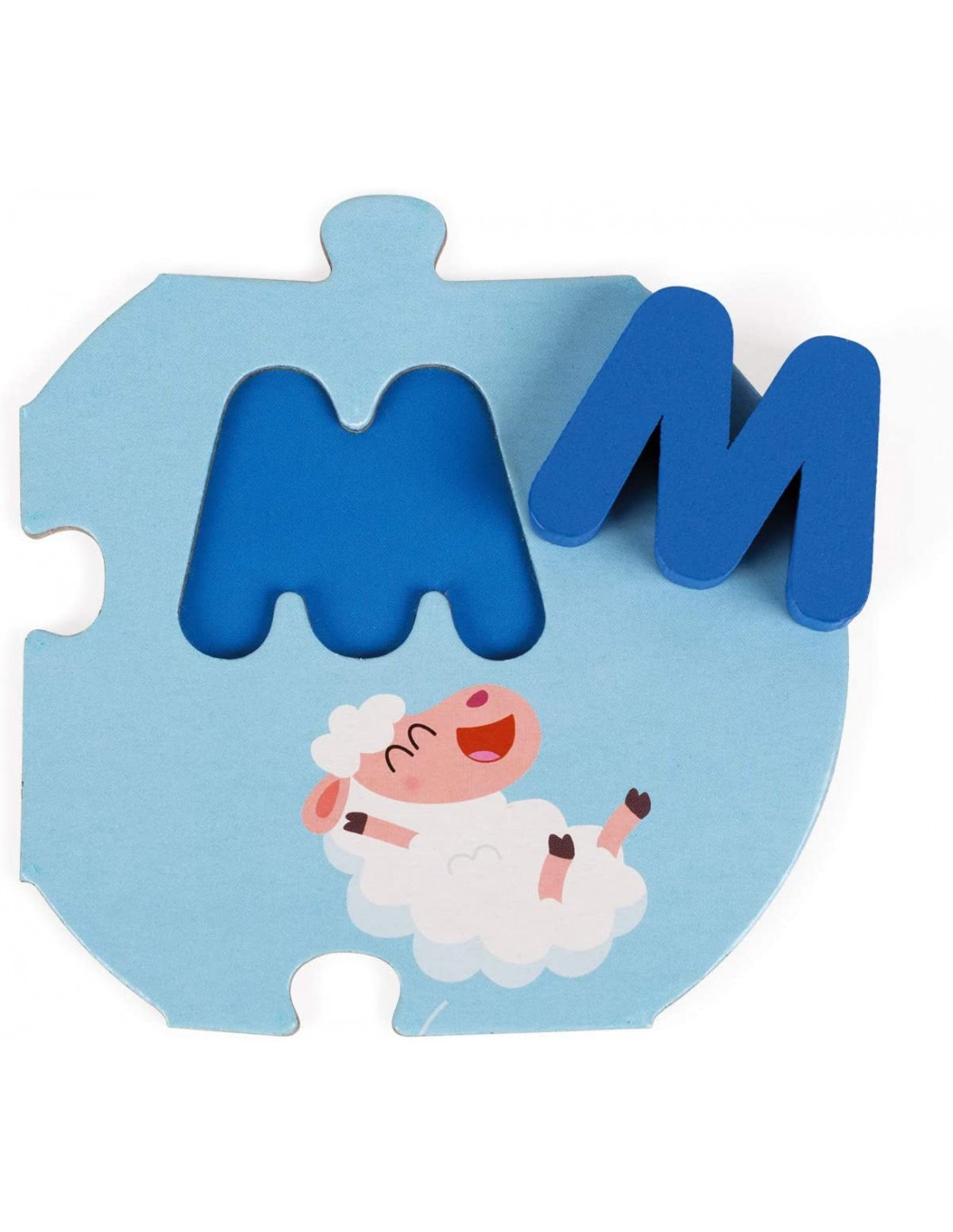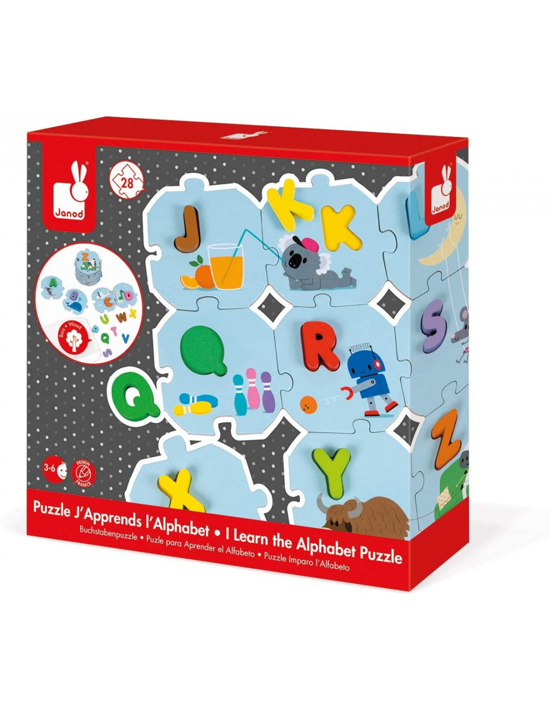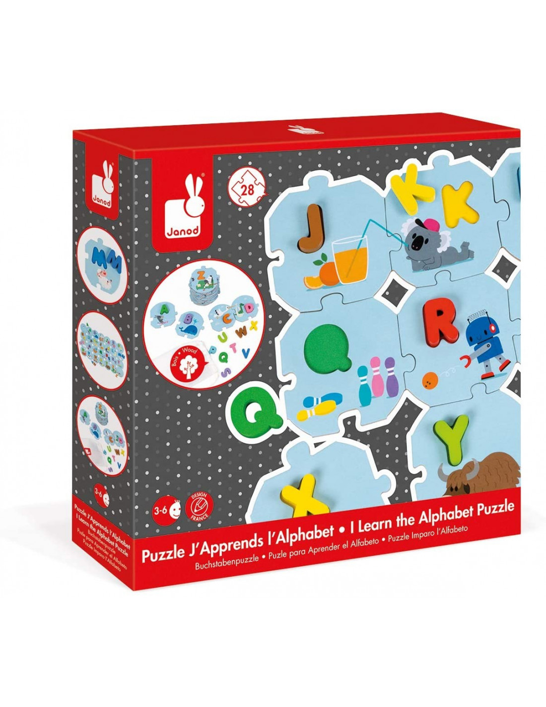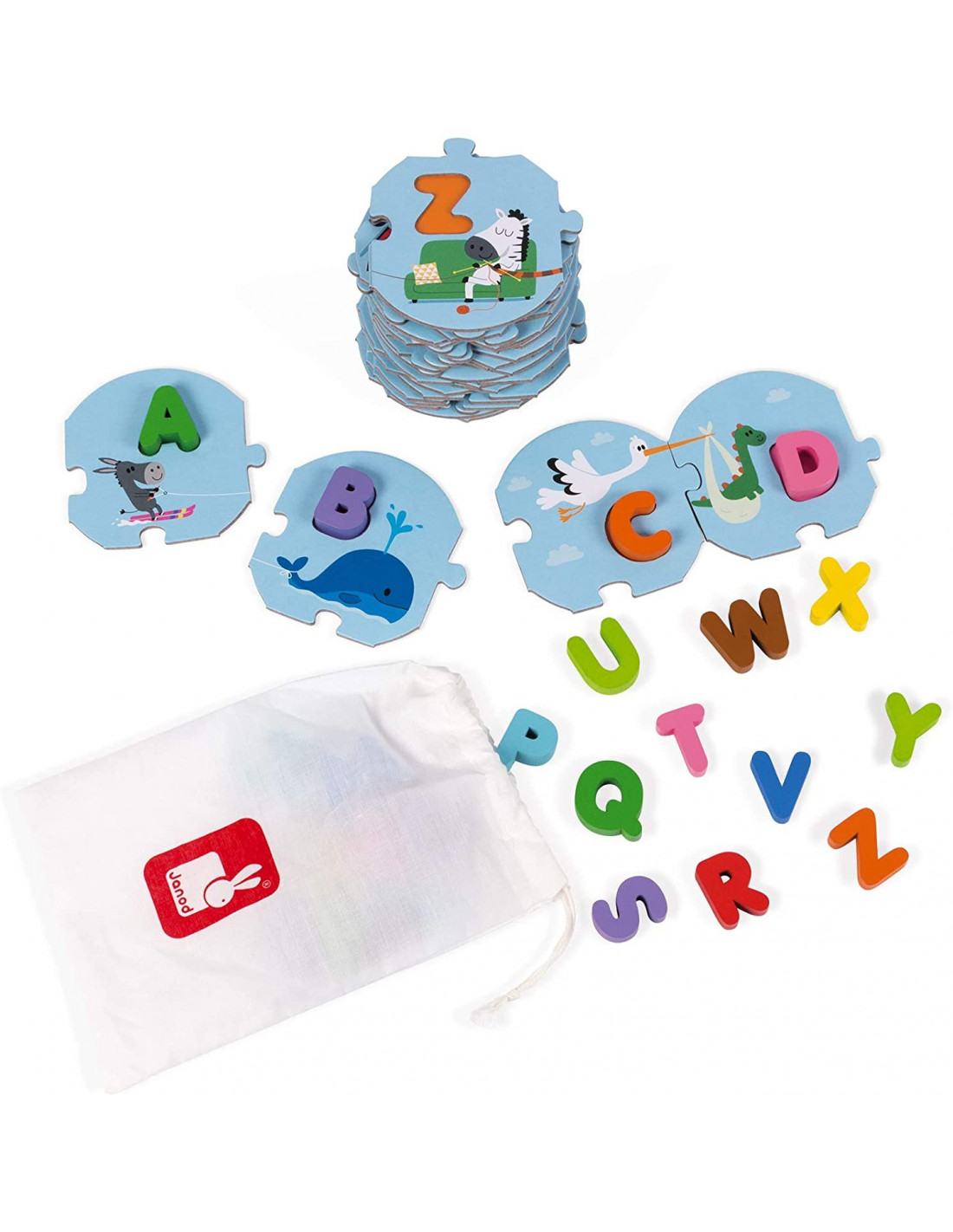 Encuentra la letra correspondiente para formar tu puzle. Este juego es ideal para aprender el alfabeto y para desarrollar la motricidad fina de tu hijo. Contiene 28 piezas de puzle de cartón y 26 letras de madera. Incluye póster.