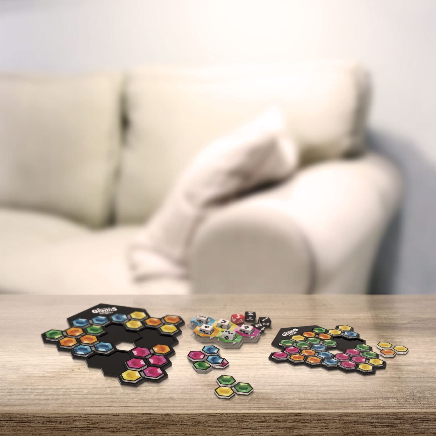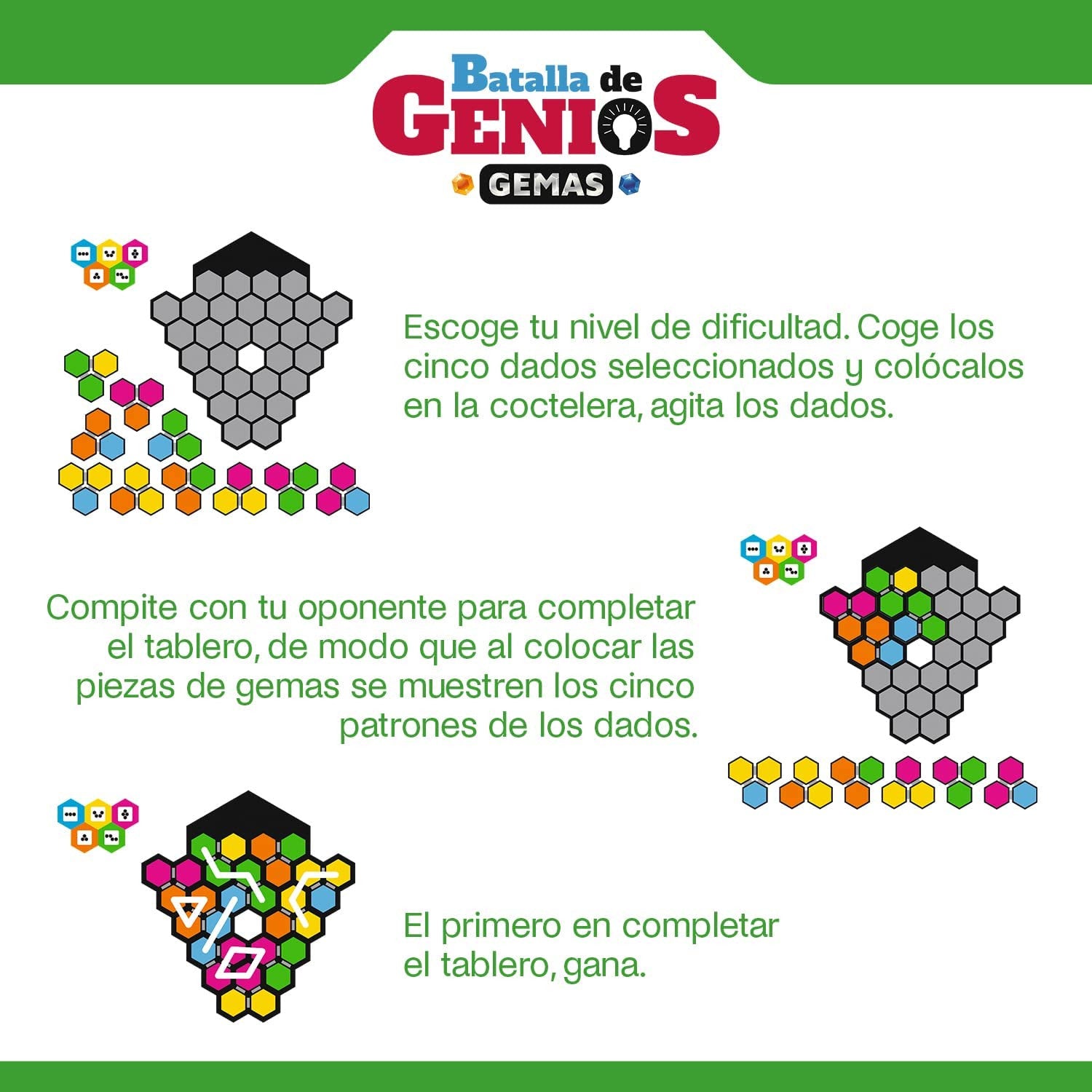 Contiene : 1 coctelera de dados, 3 dados negros, 2 tableros de gemas, 1 dado rojo, 2 sets de 10 piezas de gemas de doble cara, 5 dados blancos, Reglas de juego .
