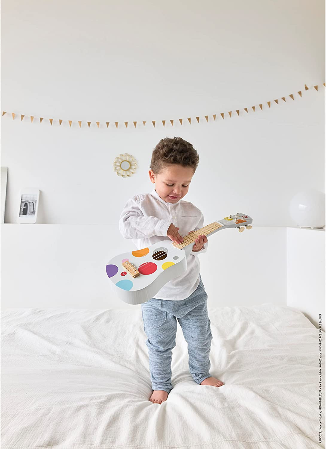 Guitarra de madera de la gama Confetti de Janod , juguete de imitación que estimula el talento de los más pequeños a partir de 3 años . Guitarra de juguete con 6 cuerdas .