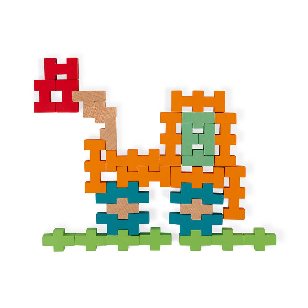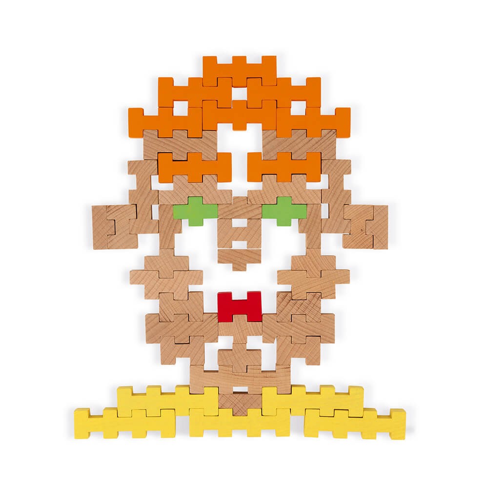 100 piezas de madera maciza (haya) de diferentes tamaños y formas en 7 colores diferentes para realizar construcciones a partir de los 6 años que te permitirán realizar construcciones espectaculares con solo encajarlas. Las 8 tarjetas modelo incluidas te permitirán hacer 14 construcciones guiándote paso a paso. Una gran idea de regalo de madera para desarrollar las habilidades motoras, la imaginación y el despertar de los niños.