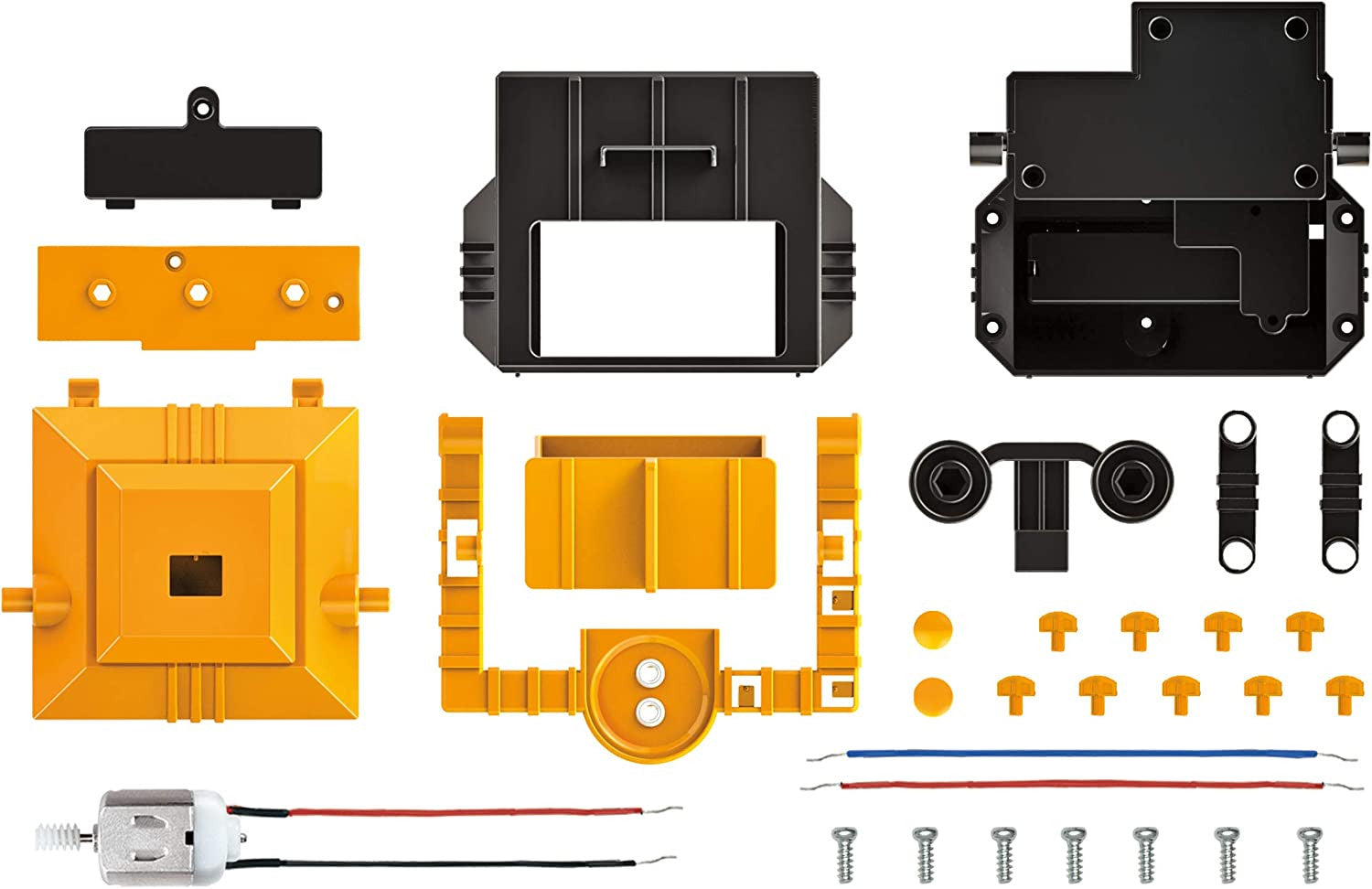 Este kit contiene: 1 juego de piezas de plástico de fácil montaje, un motor, cables, 10 tornillos, tapas de terminales, engranajes e instrucciones detalladas. También necesitará un pequeño destornillador de estrella y 1 pila AA (no incluida).