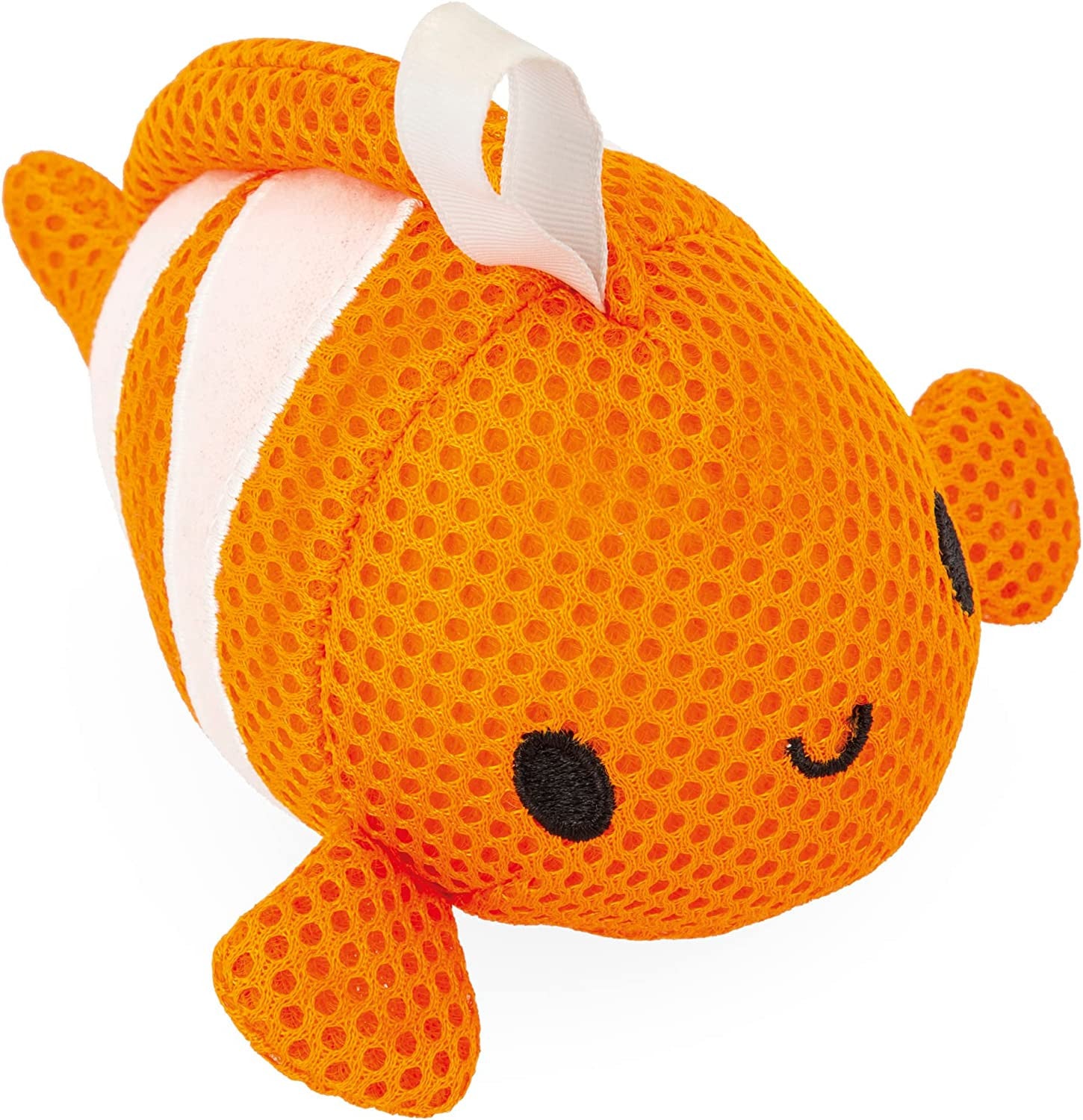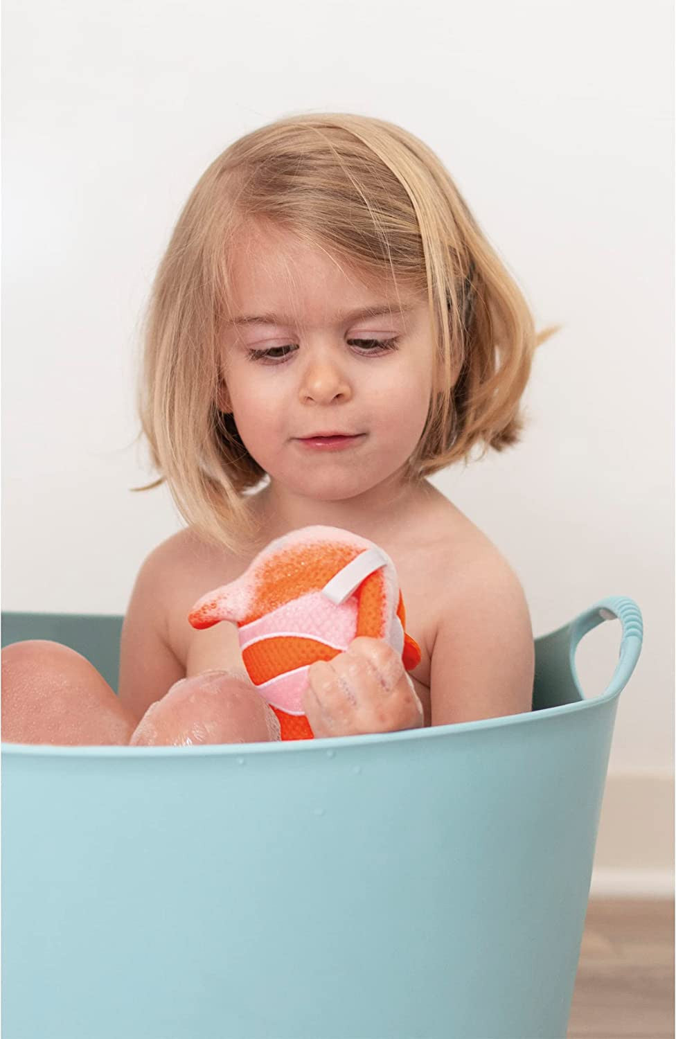 Con este juego de esponjas los niños aprenderán a enjabonarse solos , con el pez payaso , el calamar o la langosta . Basta con mojarlos y añadir un poco de gel para hacer espuma . Estos animalitos llevan un colgador en la parte superior de la cabeza para facilitar el secado .