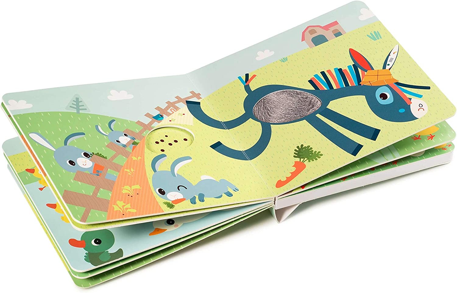 Cuenta tu propia historia de la granja con este libro de cartón lleno de maravillosos dibujos. Nombra a los animales y reconoce sus sonidos. Estimula el oído, el sentido del tacto y la imaginación.