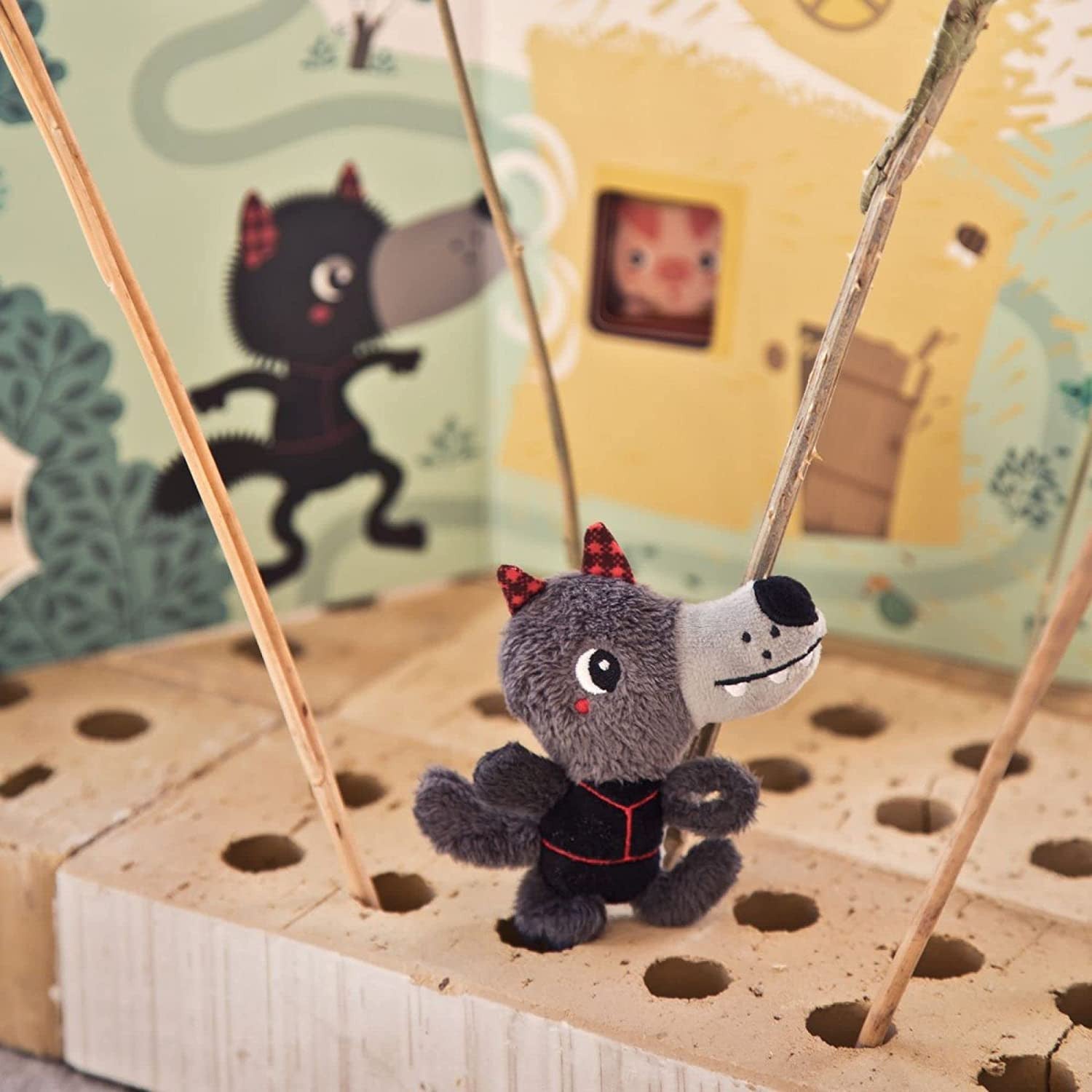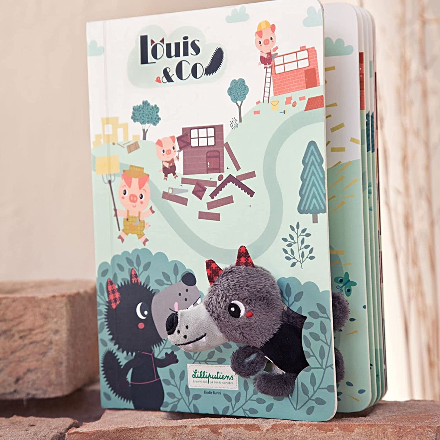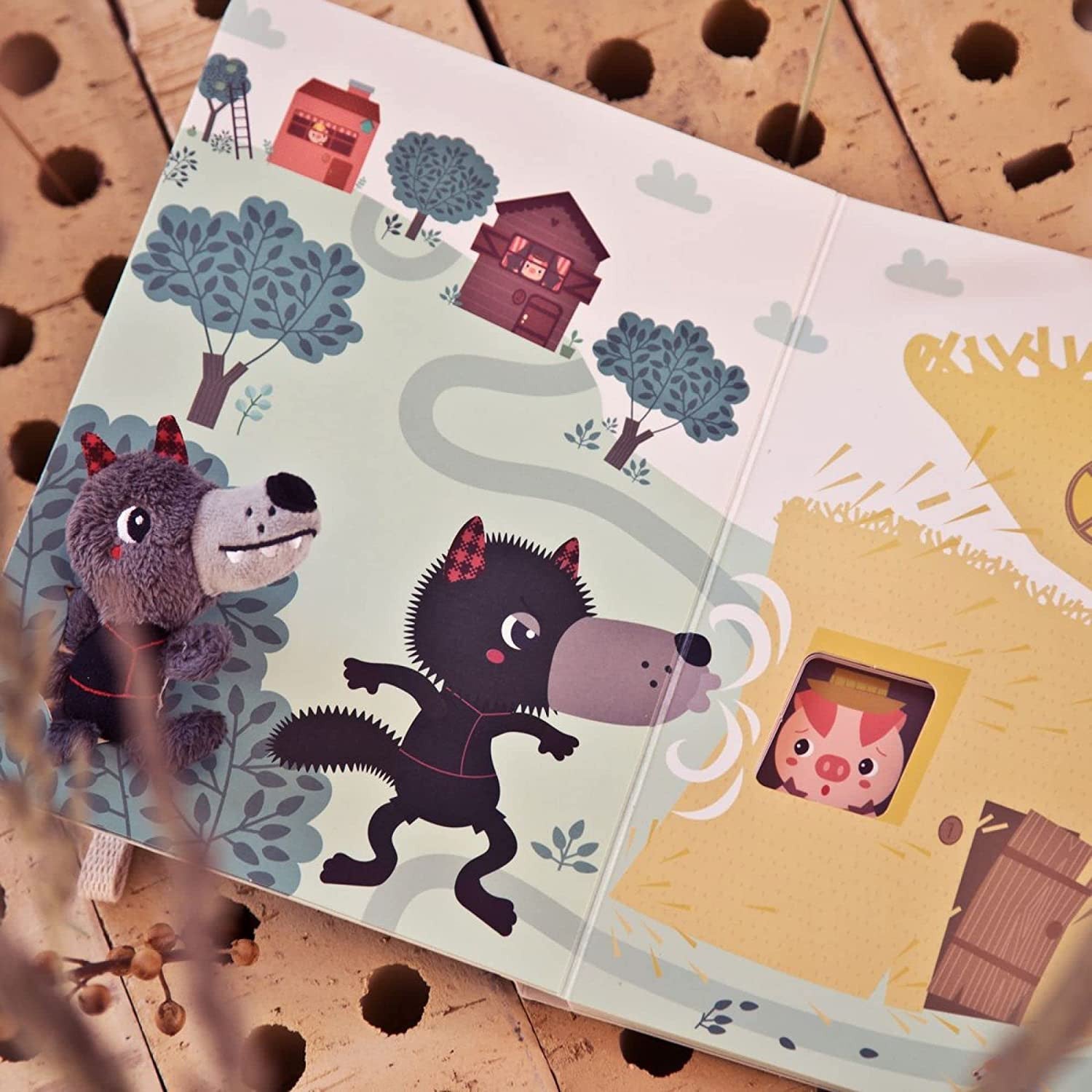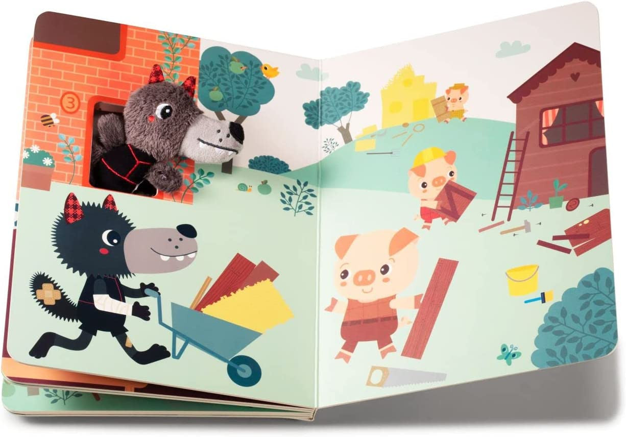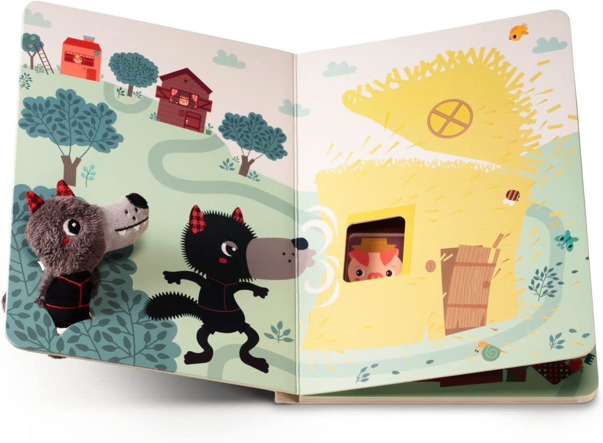 Libro curso El lobo y los 3 cerditos de Lilliputiens , con diferentes texturas en el que los niños podrán seguir página a página la trayectoria del lobo con la marioneta de tela que irá metiendo a lo largo del camino en las ranuras .
