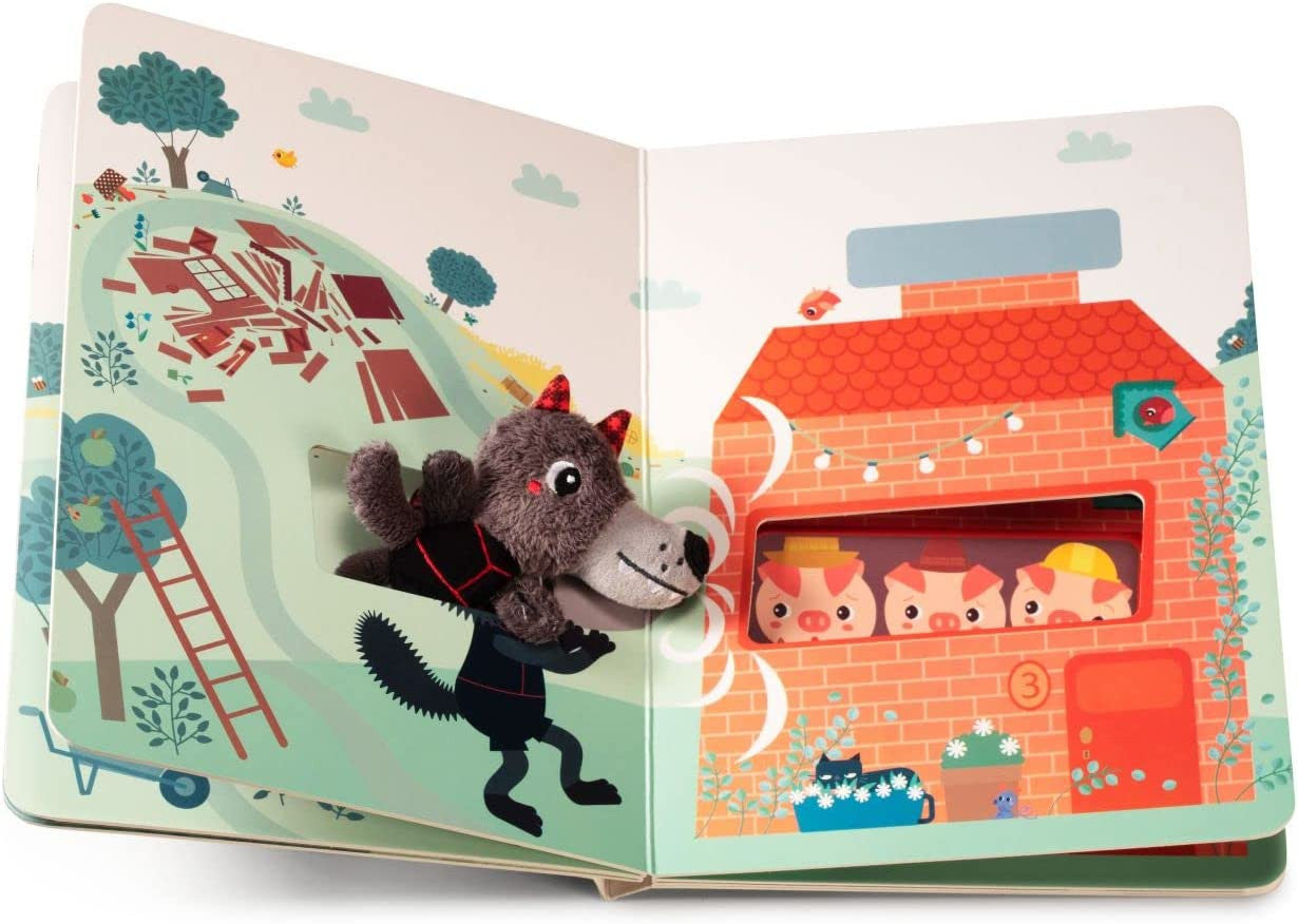 Libro El Lobo y los tres cerditos  ilustrado de Lilliputiens en el que los niños a partir de 2 años , podrán seguir página a página la trayectoria del lobo gracias a una pequeña marioneta de tela que irá metiendo a lo largo del camino en las ranuras . Así participará personalmente en este apasionante cuento al tiempo que ejercita sus dedos .