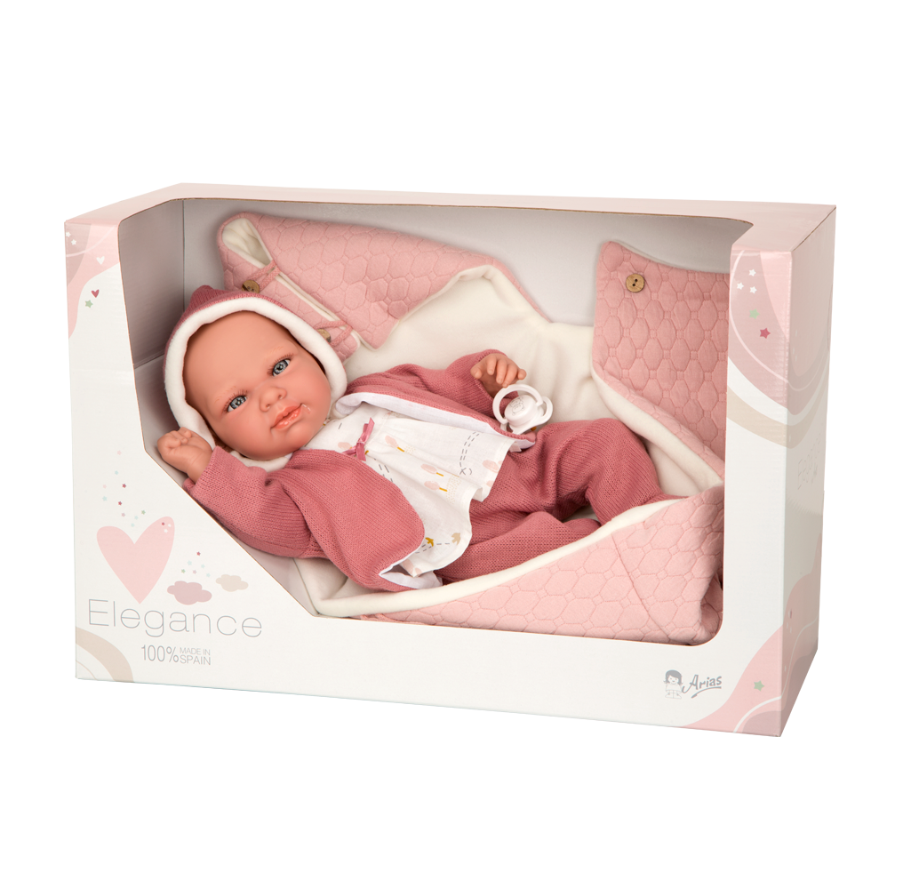Muñeca ELEGANCE de 40 CM CRIS con mecanismo de lloro, vestida en tonos rosa y blanco con mantita a juego. Incluye manta y chupete.