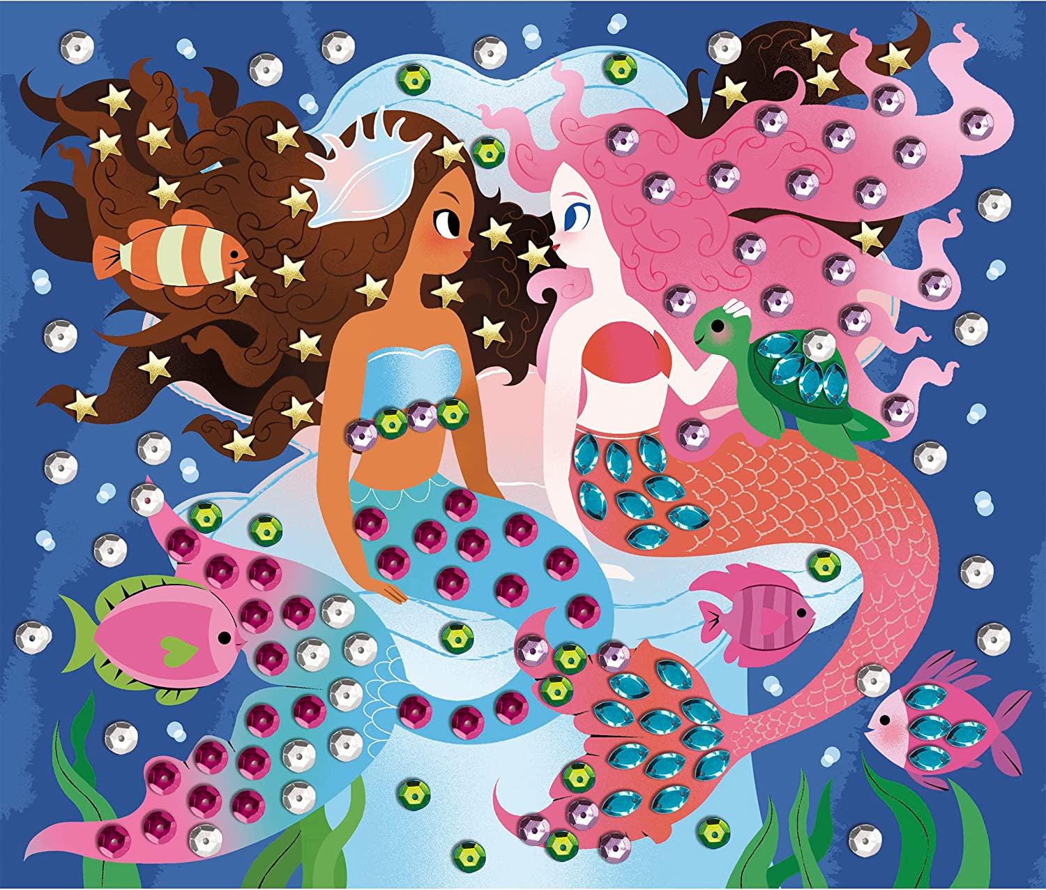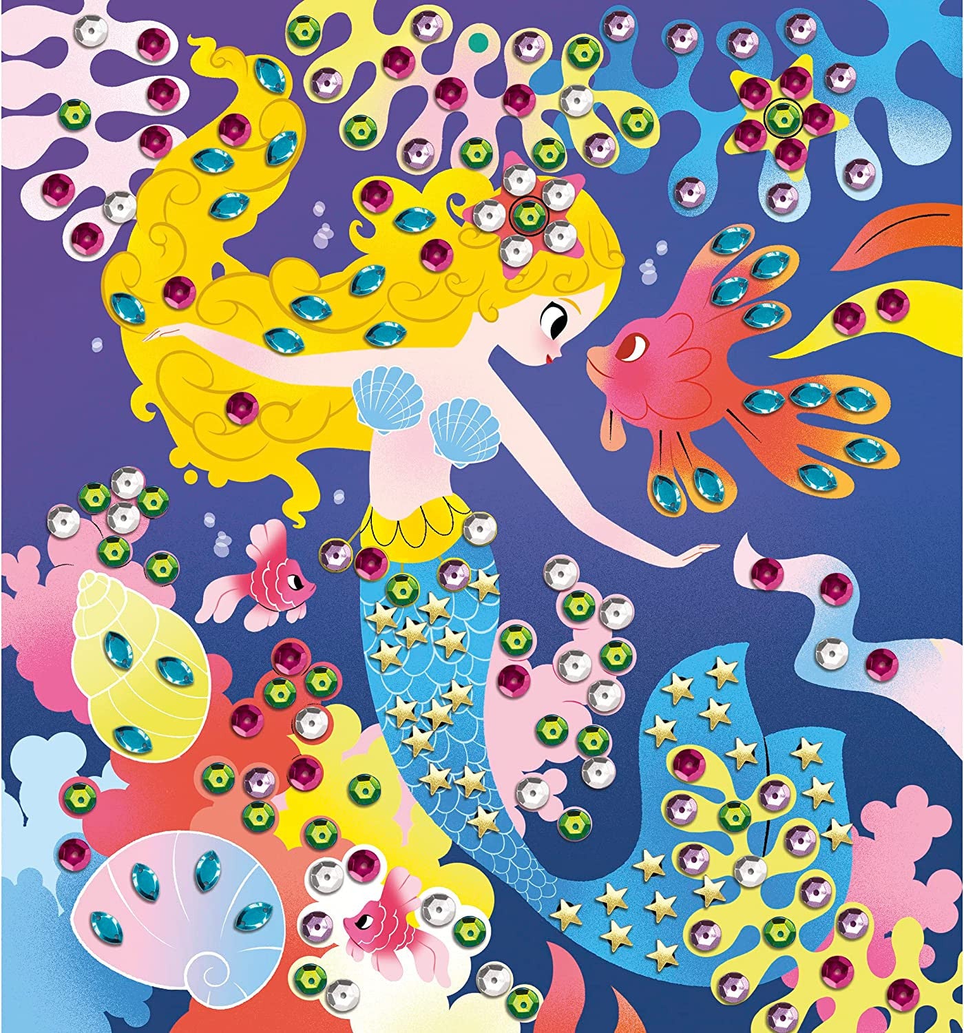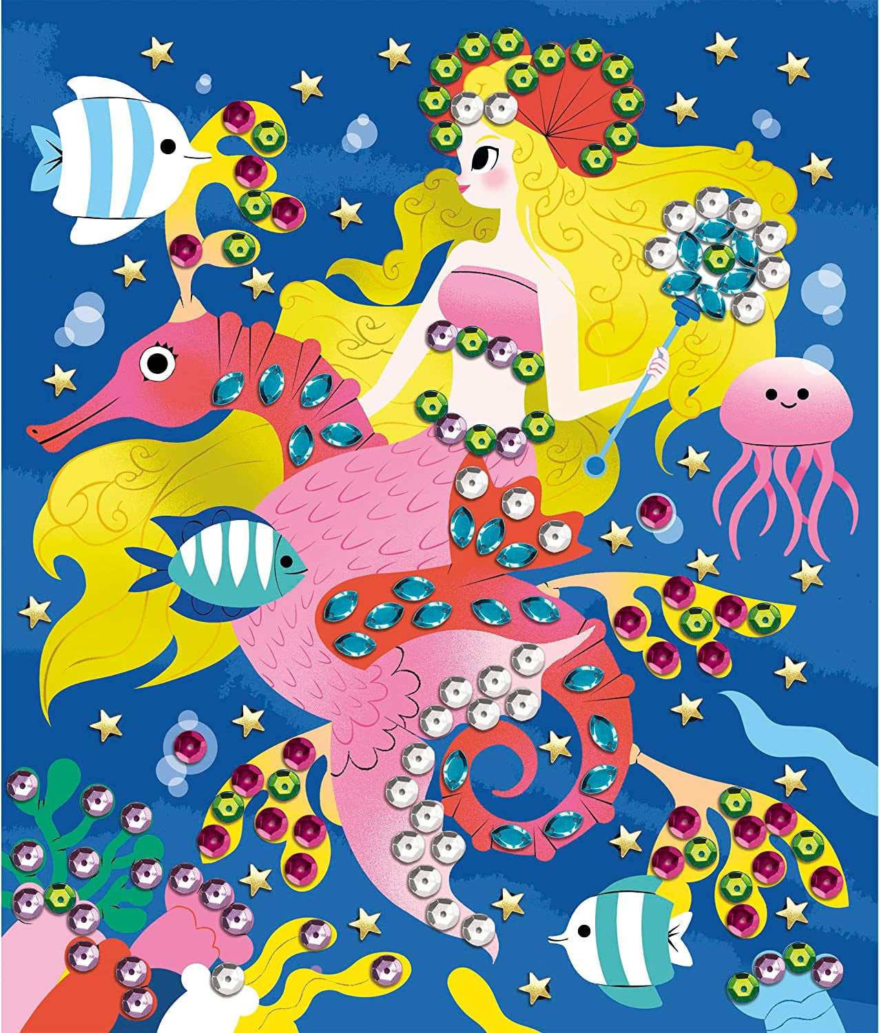 Estuche de manualidades para pegar lentejuelas que contiene cinco cuadros sobre el tema de las sirenas de Janod , un juego que estimula la motricidad fina y la concentración de los niños a partir de 6 años .
