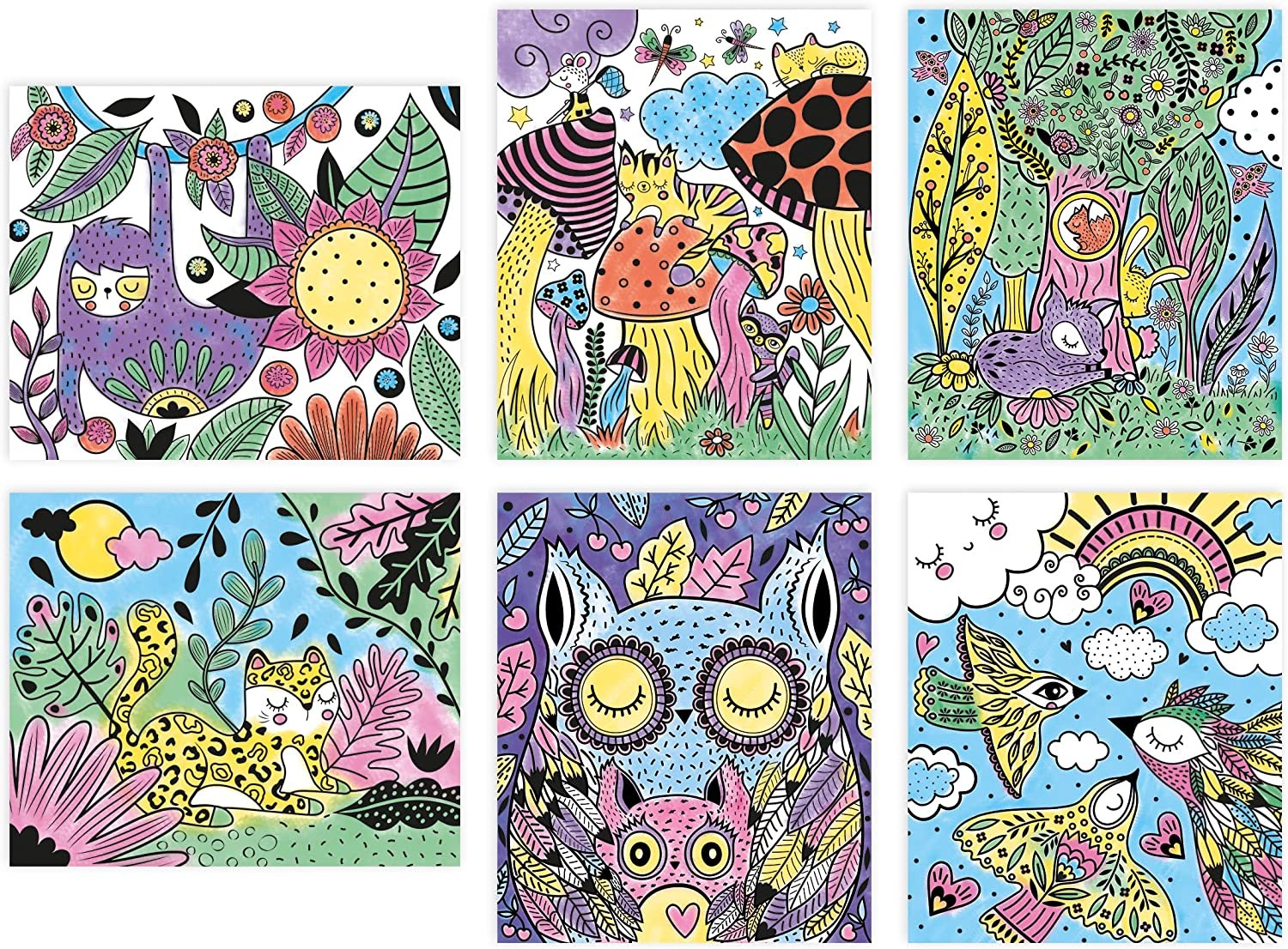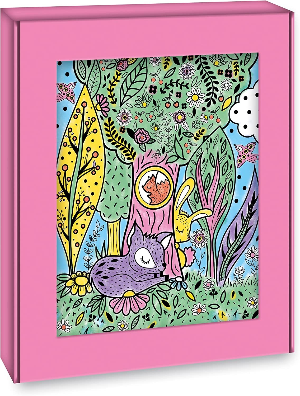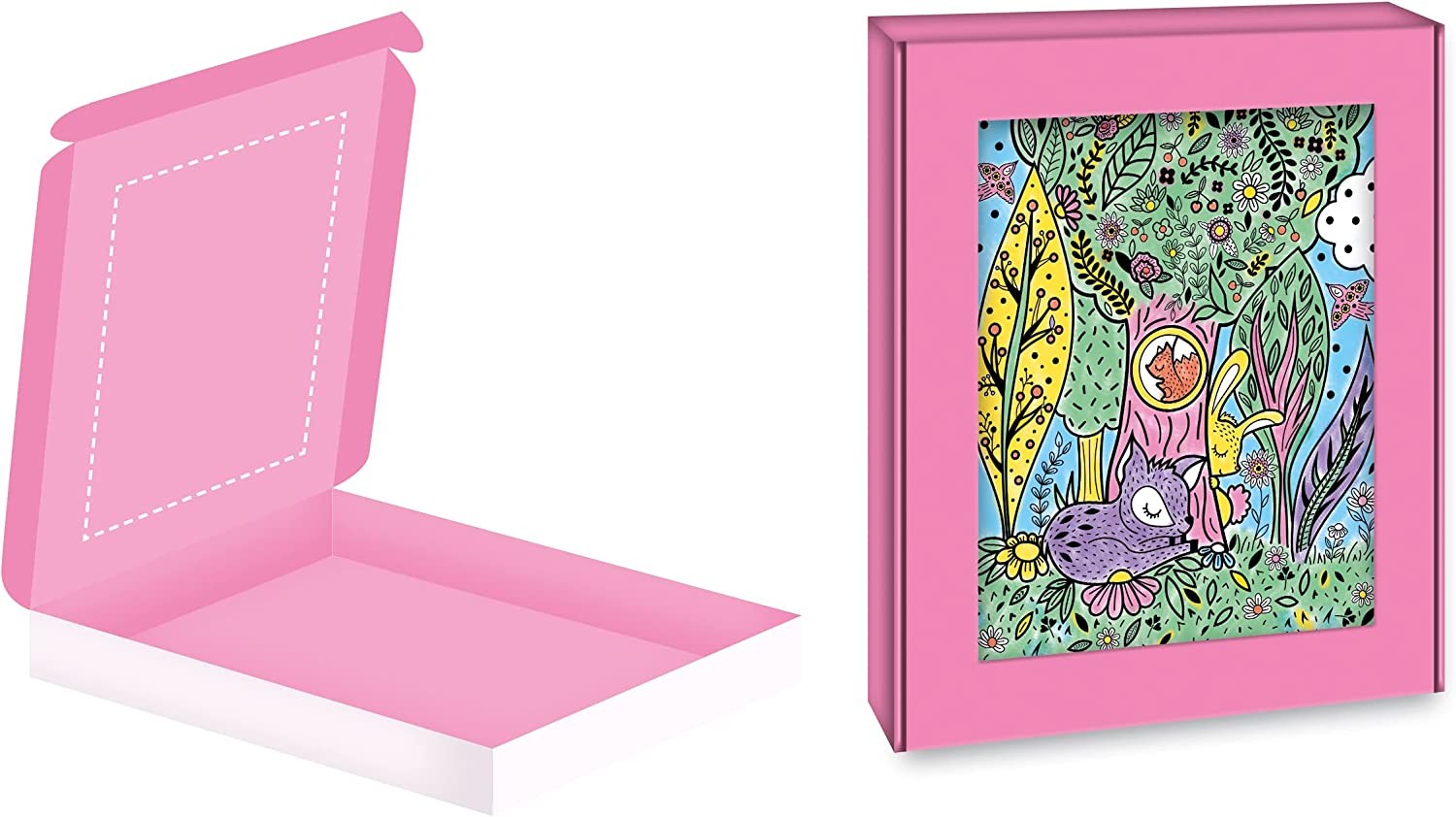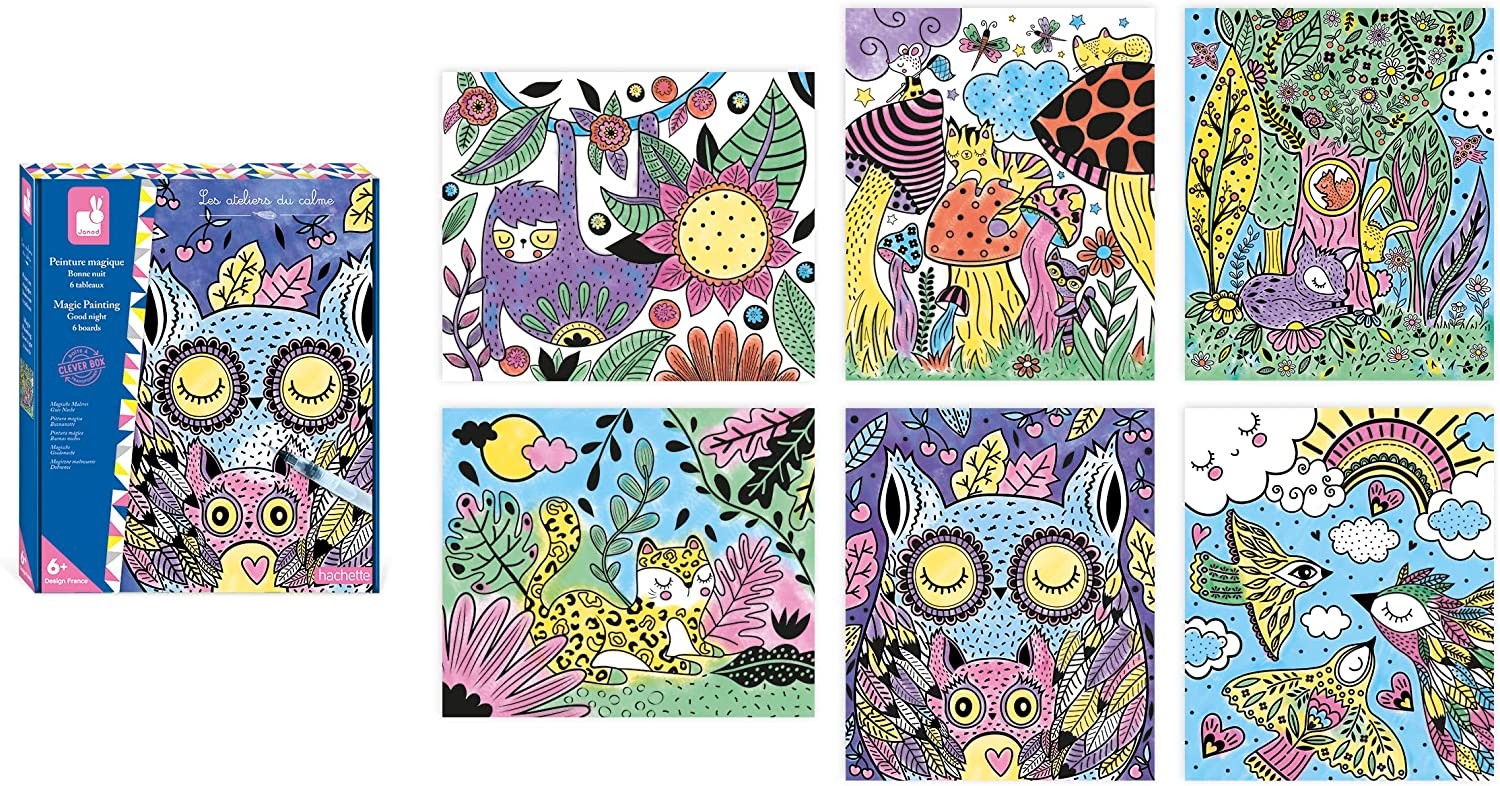 El kit contiene 6 cuadros de pintura mágica que giran en torno al tema de la noche y representan a unos tiernos animales descansando . El folleto explicativo les ayudará a avanzar paso a paso hasta dar vida a estos bonitos cuadros . La caja se convierte en un marco para poner en valor sus bellas creaciones .
